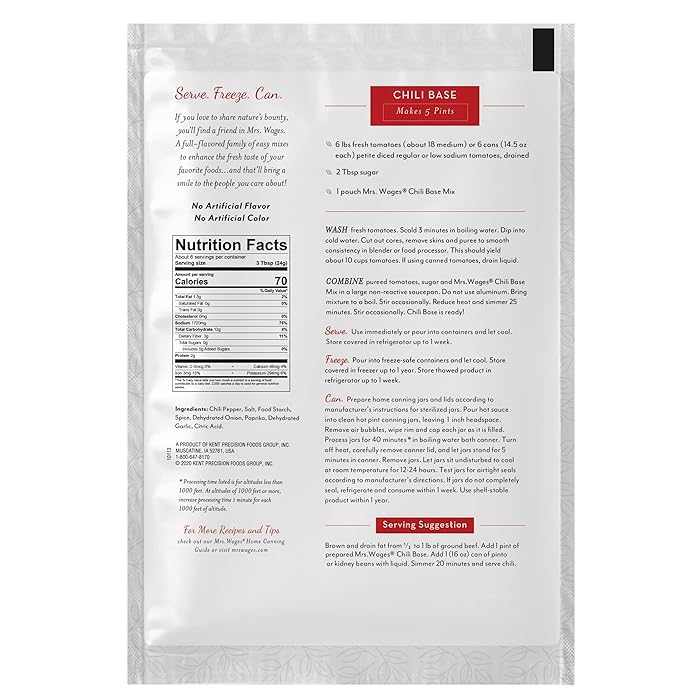 Top selling brand of the fast growing tomato sauce mix category of the home canning market. Use this mix, containing just the right spices with fresh or canned tomatoes or tomato paste, for chili you'll be proud to call your own recipe. Makes 5 pt and is ready to eat 24 hrs after preparation.