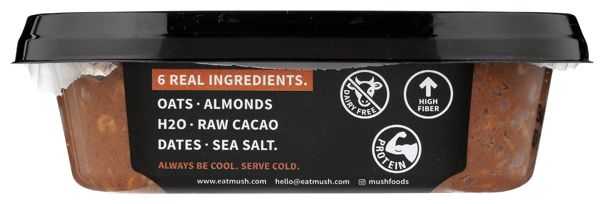 Q: What are the main ingredients in Mush Overnight Oats Dark Cacao?A: Mush Overnight Oats Dark Cacao is made with organic rolled oats, almond milk, dates, cacao powder, and sea salt. This simple ingredient list ensures that you get the most nutrients without any artificial preservatives.