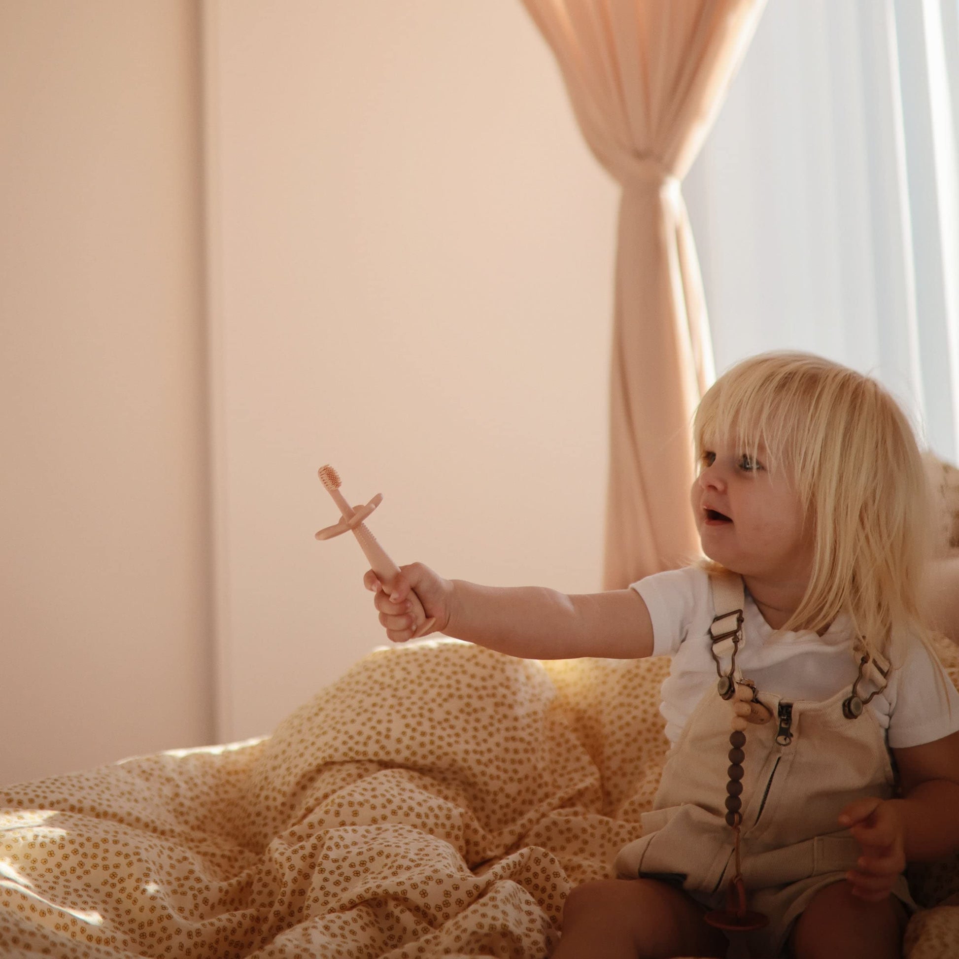 Q: What unique features does the mushie toothbrush offer?A: This toothbrush features super soft bristles that gently clean gums and teeth, a silicone suction base for convenience, and a playful design to engage your child.