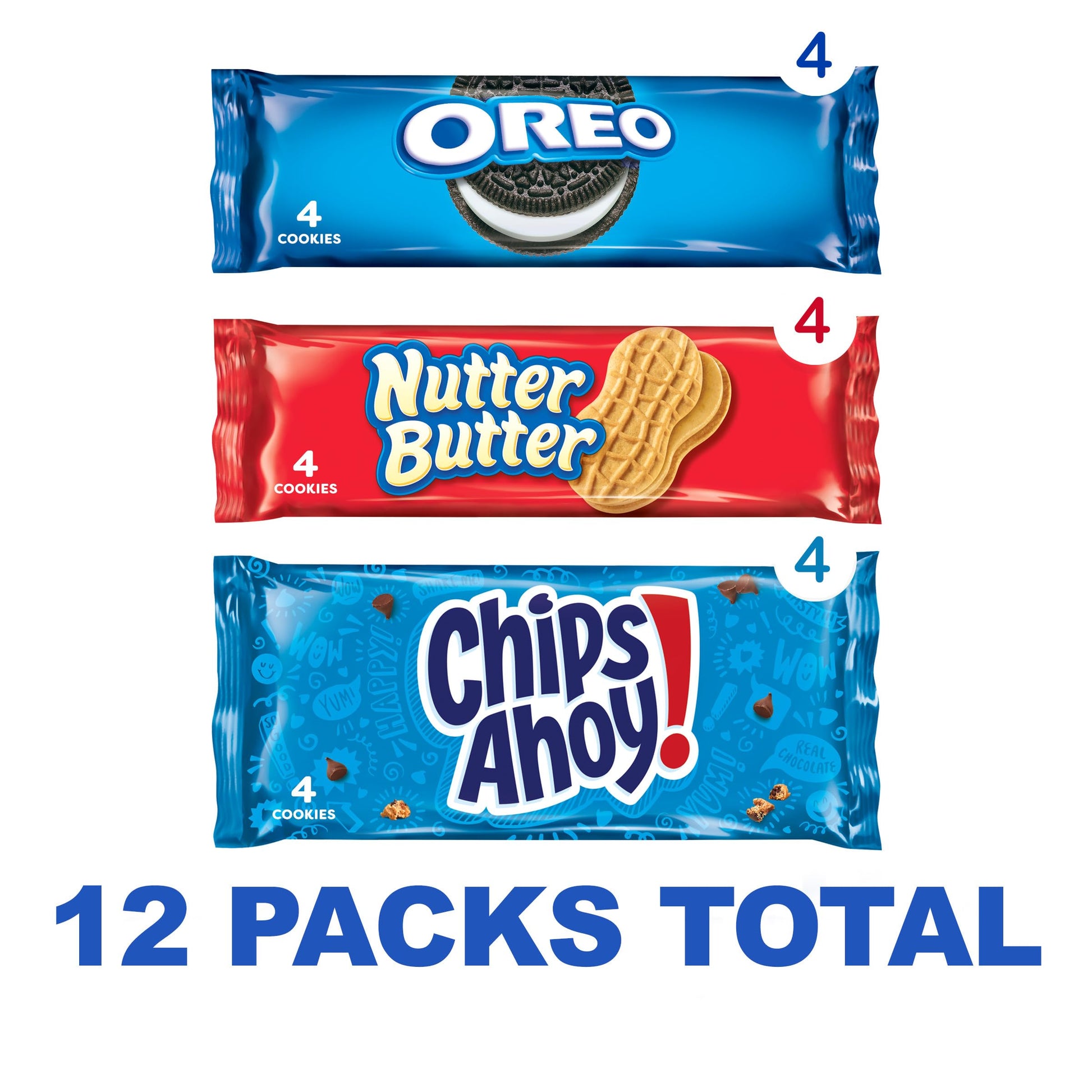 This Cookie Variety Pack includes OREO, Nutter Butter and CHIPS AHOY! cookies for sweet snacks you can enjoy on-the-go. These assorted snacks have delicious flavors, and they come in convenient cookie packs for portability. Each OREO cookie snack pack includes four chocolate sandwich cookies with delicious, original creme filling. CHIPS AHOY! cookies are crunchy and packed with yummy chocolate chips for a tasty snack with four cookies in each pack. Nutter Butter Peanut Butter Sandwich Cookies have a smooth filling for satisfying sweetness in every one of the four cookies in each pack. These assorted cookies are great on the go snacks. Tuck these snack size cookies into school lunchboxes for sweet lunch snacks, keep some in your desk for office snacks or toss them in your purse or backpack as tasty travel snacks. Bulk cookies also make great party favors, stocking stuffers, Easter basket fillers or sweet treats for Halloween trick or treating. These snack pack cookies are individually portioned to maintain freshness and flavor.