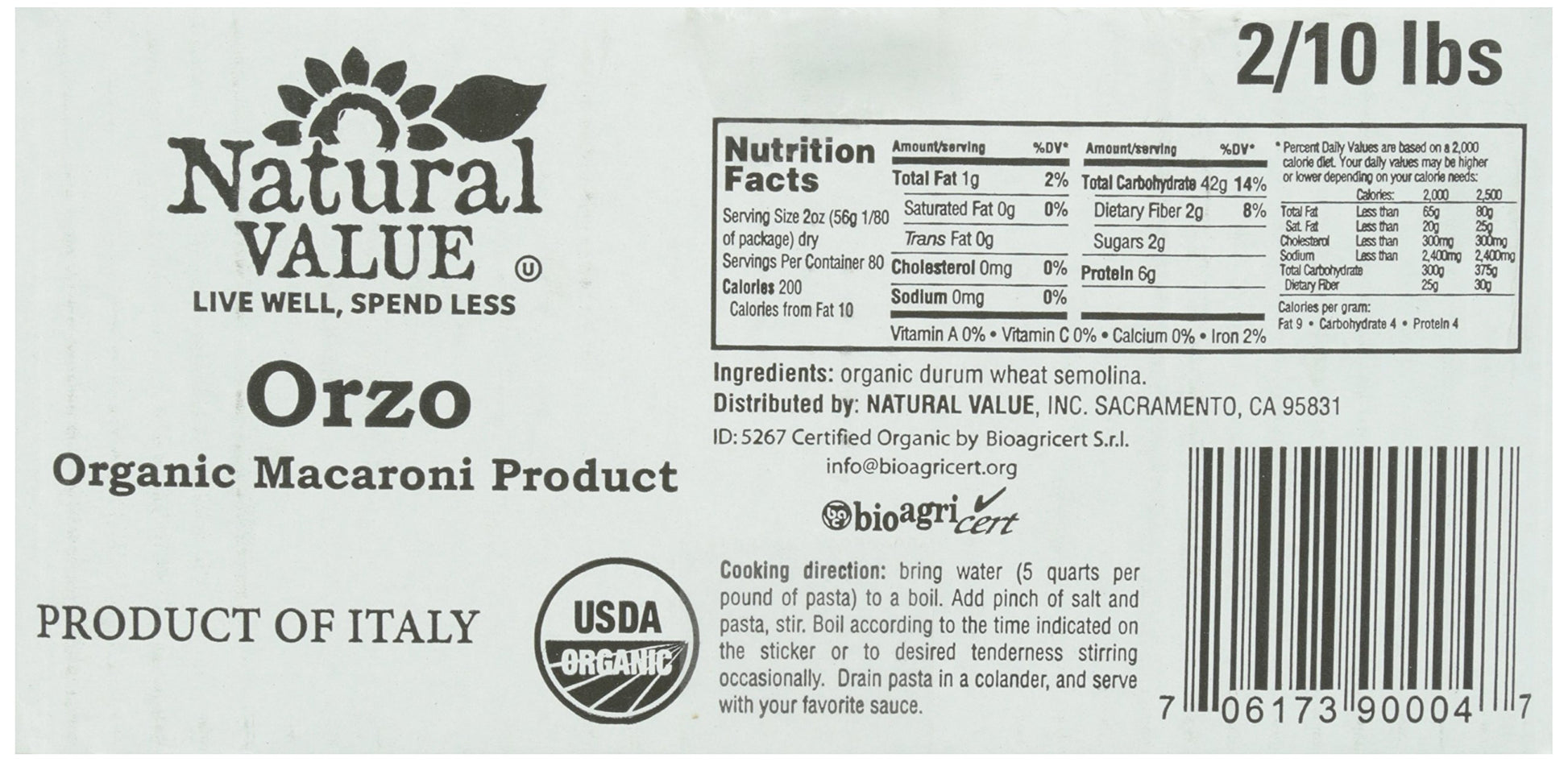 Q: Is this orzo product certified organic?A: Yes, Natural Value Organic Orzo is certified organic, ensuring that it is made from high-quality ingredients without synthetic pesticides or fertilizers.