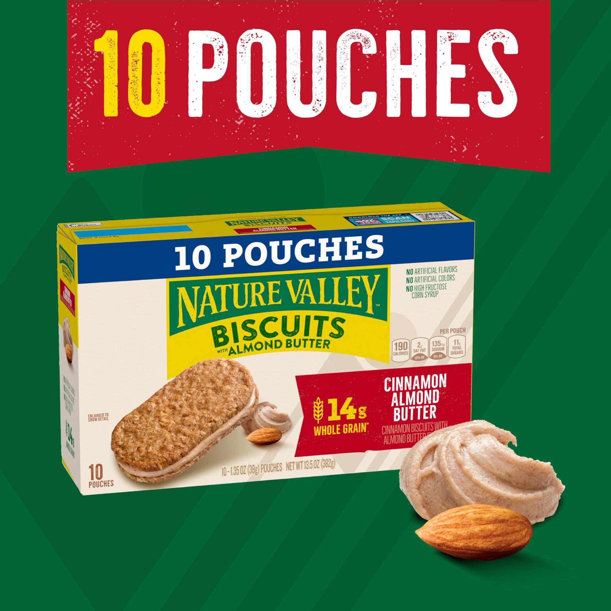 Crunchy. Creamy. Gone. These crispy biscuits are made with whole grain oats and topped with creamy peanut butter, coconut butter or almond butter filling for a tasty on-the-go snack. Enjoy them for snack breaks, during breakfast, or any time you crave an invigorating treat. They're made with 14g of whole grain (at least 48g recommended daily), and have no high fructose corn syrup or artificial flavors. A portable snack perfect for the pantry, lunch box, and hiking trail. At Nature Valley, we believe that what you put in is what you get out. So wherever the moment takes you and your family, you can rely on our great-tasting snacks to help keep you going. Contains 10 biscuits.