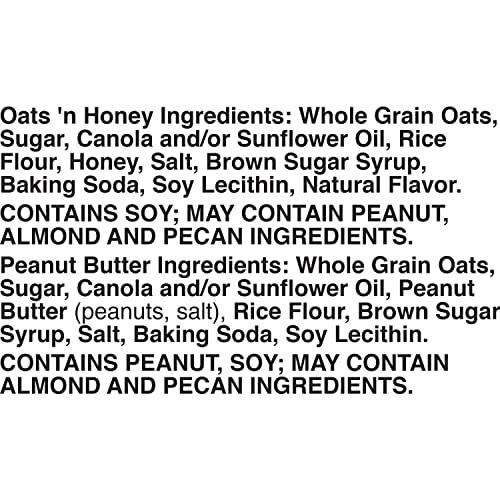 The Original Crunch. Our Nature Valley Crunchy Variety Pack includes Oats 'n Honey and Peanut Butter Granola Bars. These tasty and convenient snacks are made with the goodness of whole grain oats. Each bar provides 20g of whole grain per serving (at least 48g recommended daily). They're made with no artificial flavors, colors or sweeteners - just the delicious taste you'd expect from Nature Valley. It's a breakfast snack bar, an office snack or an on-the-go treat everyone in your household can enjoy. At Nature Valley, we believe that what you put in is what you get out. So wherever the moment takes you and your family, you can rely on our great-tasting snacks to help keep you going. Includes 15 two-bar pouches, 30 bars total.