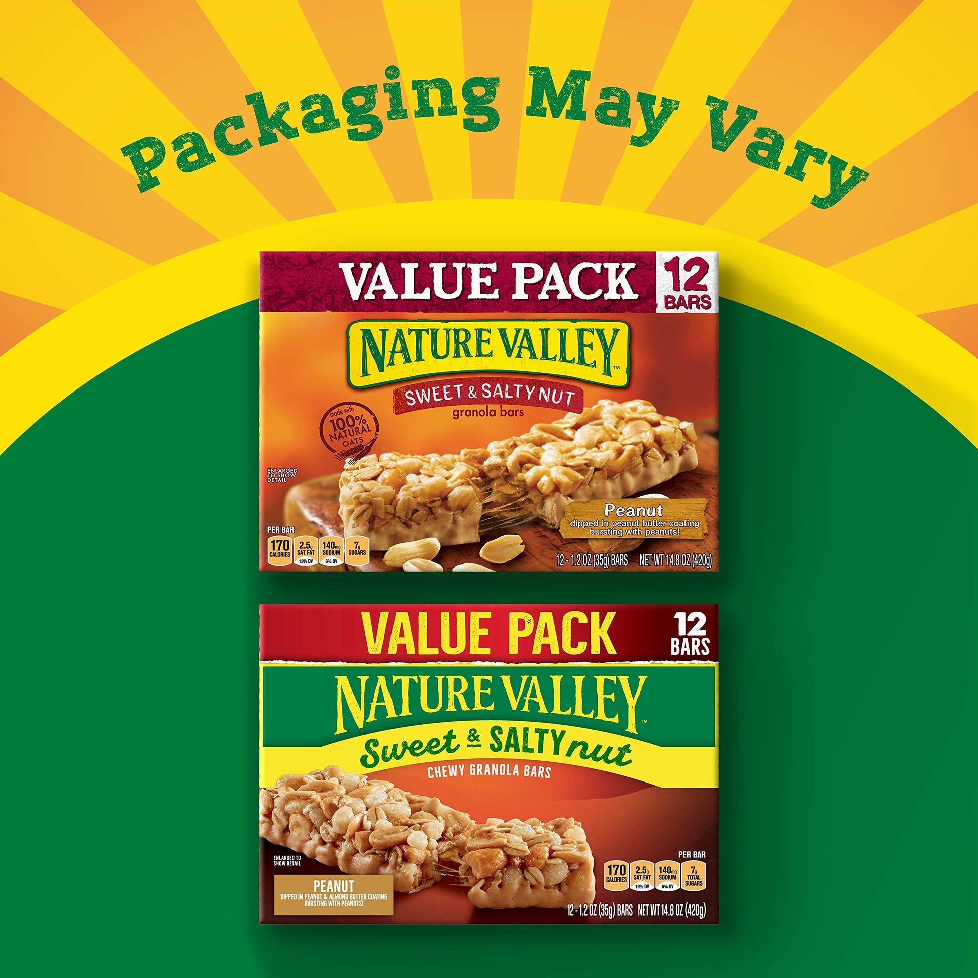 Sweet. Salty. Adventure-ready. Our Sweet & Salty Peanut Granola Bars provide a perfect balance of savory nuts and sweet granola. They're made with no artificial flavors, artificial colors, or high fructose corn syrup - just the delicious taste you’d expect from Nature Valley. Stock up on these granola bars for a breakfast snack bar, an office snack, or an on-the-go treat everyone in your household can enjoy. These granola bars are a portable snack that’s perfect for the pantry, lunch box, and hiking trail. At Nature Valley, we believe that what you put in is what you get out. So wherever the moment takes you and your family, you can rely on our great-tasting snacks to help keep you going. Contains 12 bars.