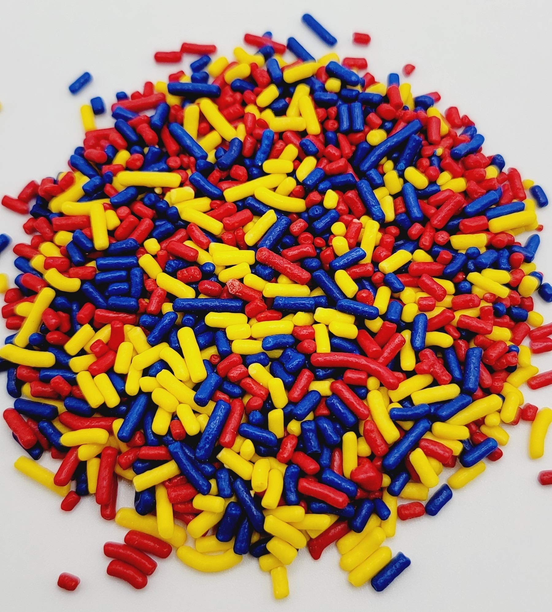 Q: What are NCS Red, Yellow, and Dark Blue Edible Jimmies Sprinkles made of?A: NCS Red, Yellow, and Dark Blue Edible Jimmies Sprinkles are made from ingredients that are gluten free, nut free, and dairy free, ensuring they are suitable for a variety of dietary needs.