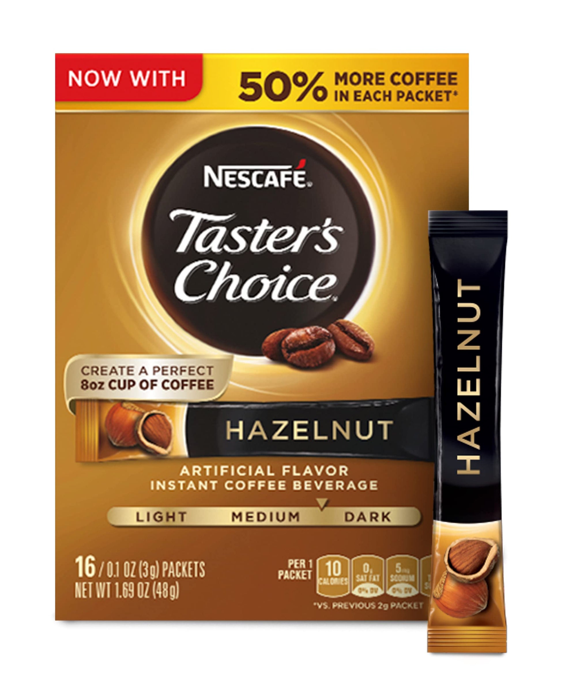 - Q: How many cups can I make from one box of NESCAFÉ Taster's Choice? A: One box of NESCAFÉ Taster's Choice Hazelnut Flavored Instant Coffee contains 16 packets, allowing you to make 16 cups of premium instant coffee.