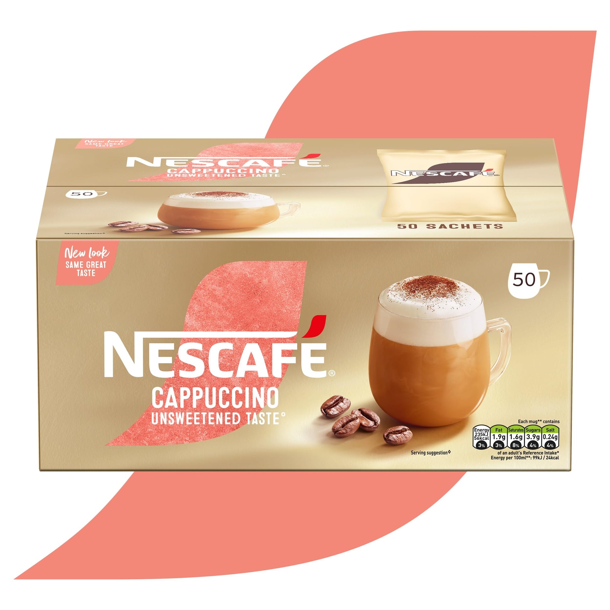 Nescaf's Cafe Menu Cappuccino makes the perfect Cappuccino straight from the sachet. Simply add hot water, stir and enjoy!Unsweetened taste50 One cup sachetsTotal weight 800gIngredients: Instant Coffee, Low Fat Whitener