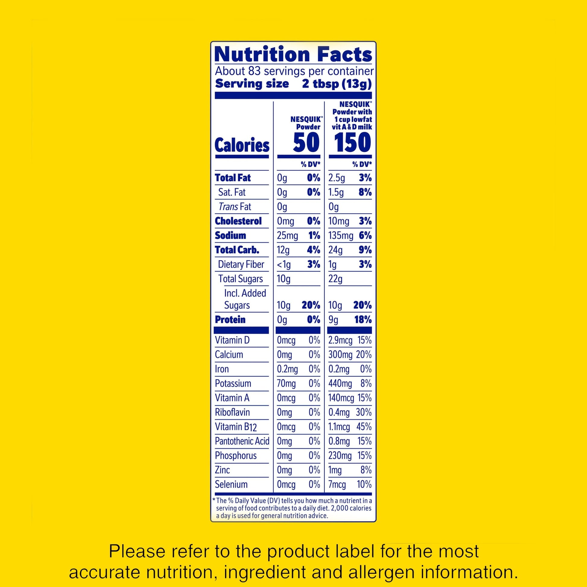 Nesquik Chocolate Powder Drink Mix added to milk makes an irresistibly delicious and nutritious drink. Now back to its classic formula, this Nesquik chocolate milk powder also contains no artificial sweeteners, flavors or colors. Plus, this chocolate milk mix is made with real cocoa powder and no high fructose corn syrup for a nourishing drink that doesn't sacrifice on flavor. Chocolate Nesquik is perfect at breakfast to get kids ready for the day. The chocolate drink powder lets you choose how chocolatey you want your beverage to be. Just add two tablespoons of the Nesquik powder to a glass of cold milk for classic chocolate milk.