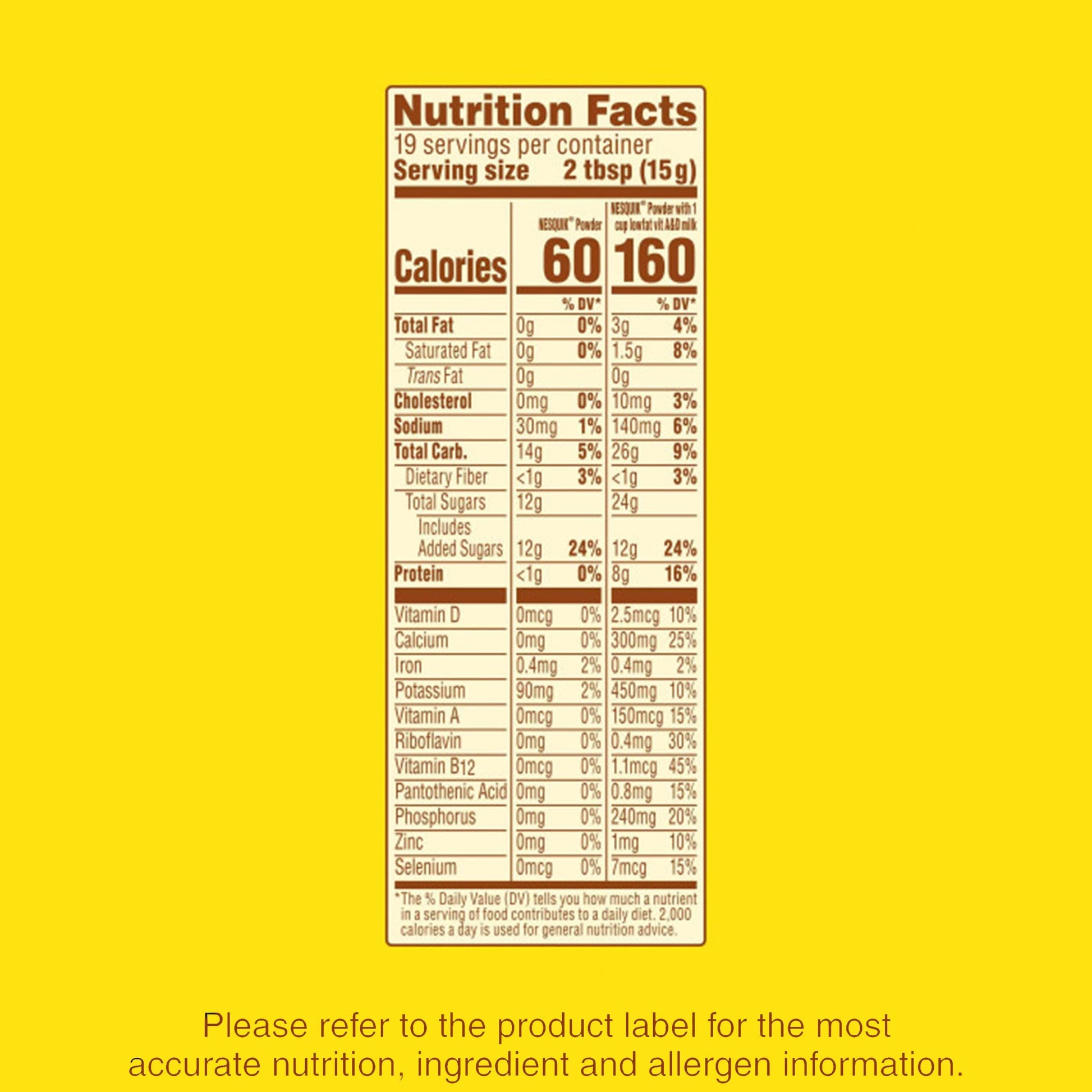 Nesquik Chocolate Powder Drink Mix Added To Milk Makes An Irresistibly Delicious And Nutritious Drink. Now Back To Its Classic Formula, This Nesquik Chocolate Milk Powder Also Contains No Artificial Sweeteners, Flavors Or Colors. Plus, This Chocolate Milk Mix Is Made With Real Cocoa Powder And No High Fructose Corn Syrup For A Nourishing Drink That Doesn'T Sacrifice On Flavor. Chocolate Nesquik Is Perfect At Breakfast To Get Kids Ready For The Day. The Chocolate Drink Powder Lets You Choose How Chocolatey You Want Your Beverage To Be. Just Add Two Tablespoons Of The Nesquik Powder To A Glass Of Cold Milk For Classic Chocolate Milk.