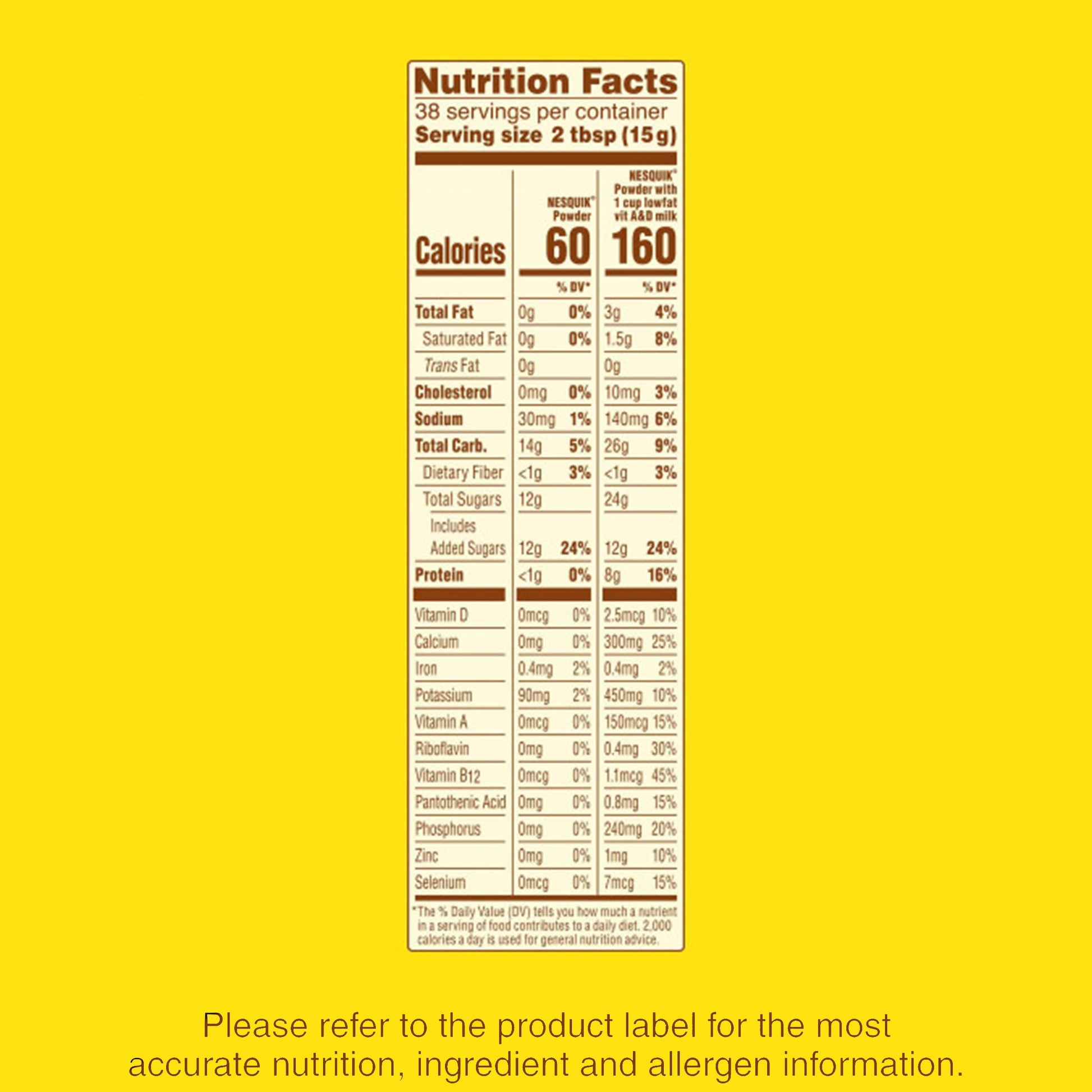 Nesquik Chocolate Powder Drink Mix added to milk makes an irresistibly delicious and nutritious drink. Now back to its classic formula, this Nesquik chocolate milk powder also contains no artificial sweeteners, flavors or colors. Plus, this chocolate milk mix is made with real cocoa powder and no high fructose corn syrup for a nourishing drink that doesn't sacrifice on flavor. Chocolate Nesquik is perfect at breakfast to get kids ready for the day. The chocolate drink powder lets you choose how chocolatey you want your beverage to be. Just add two tablespoons of the Nesquik powder to a glass of cold milk for classic chocolate milk.