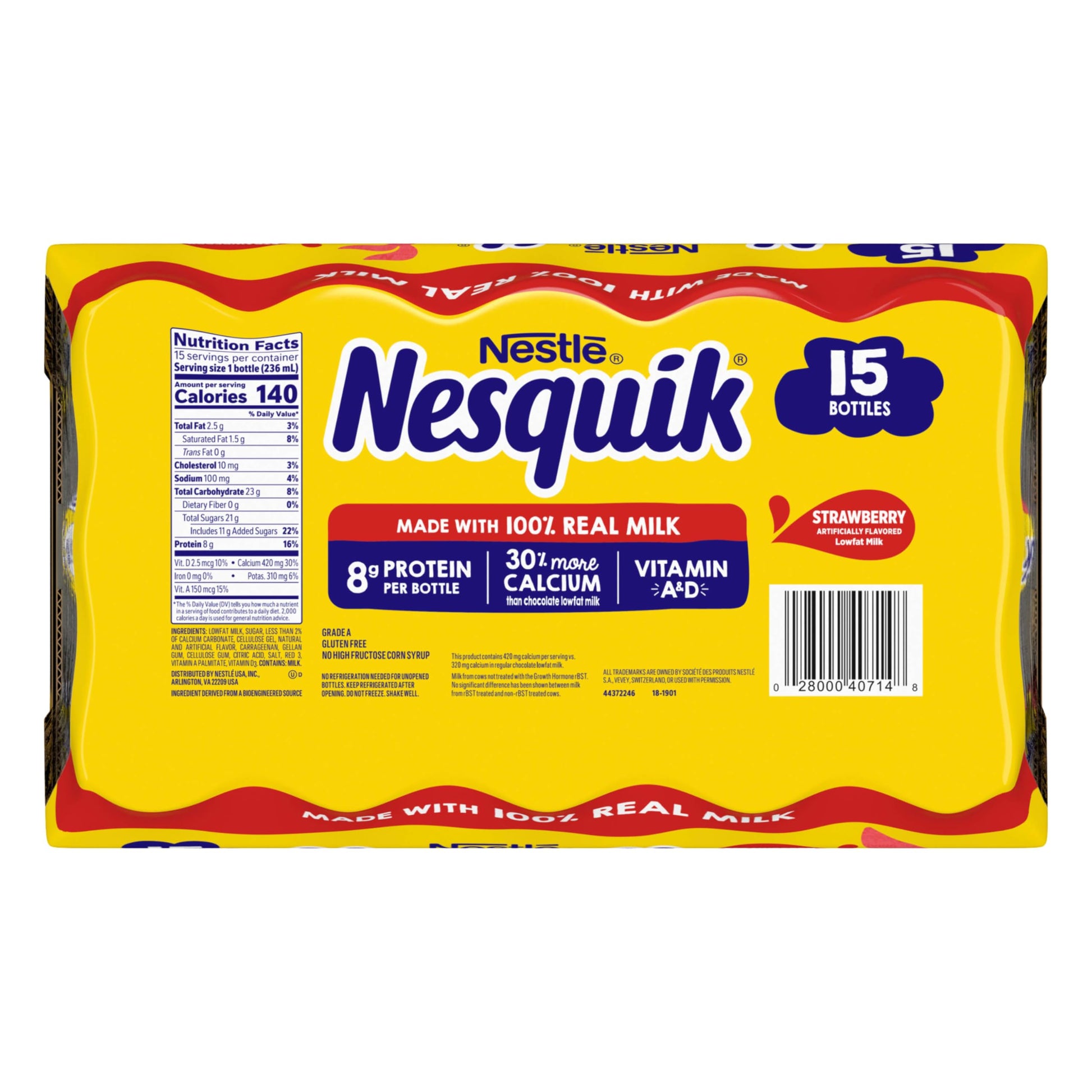 Start your day off right with Nesquik Strawberry Flavored Low-Fat Milk The perfect way to begin your morning Satisfy the bunny in you in a snap with this fifteen-pack of Nesquik Strawberry Flavored Low-Fat Milk. Just chill this shelf-stable milk in the fridge, then shake for a sweet and nostalgic strawberry drink packed with eight grams of protein. This Nesquik ready-to-drink milk is made with 100% real milk.
