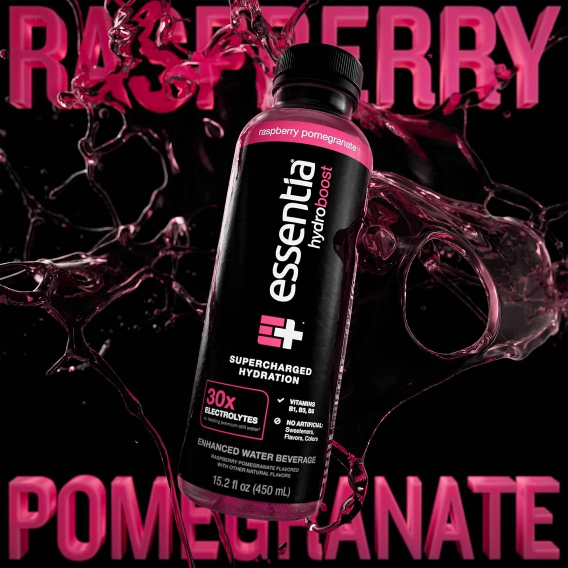 - Q: Does Essentia Hydroboost contain any artificial ingredients? A: No, Essentia Hydroboost is free from artificial sweeteners, flavors, and colors. It uses natural ingredients to deliver a refreshing raspberry pomegranate taste with only 30 calories per bottle.