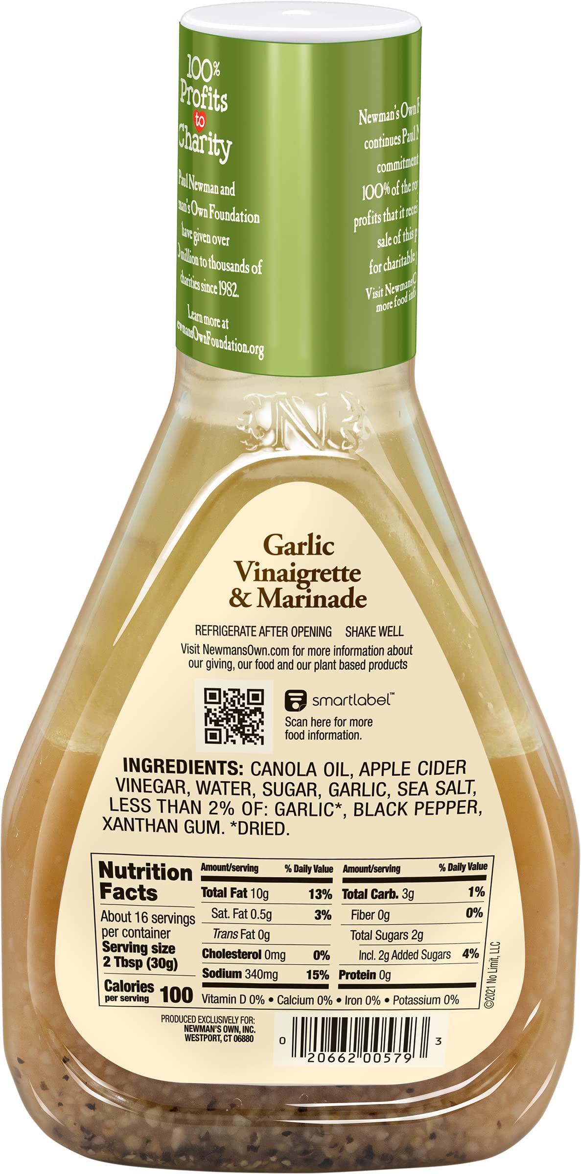 - Q: What is the size of the Newman's Own Garlic Vinaigrette & Marinade bottle? A: The Newman's Own Garlic Vinaigrette & Marinade comes in a 16 oz bottle, making it a convenient size for various culinary uses, whether for dressing salads or marinating meats.
