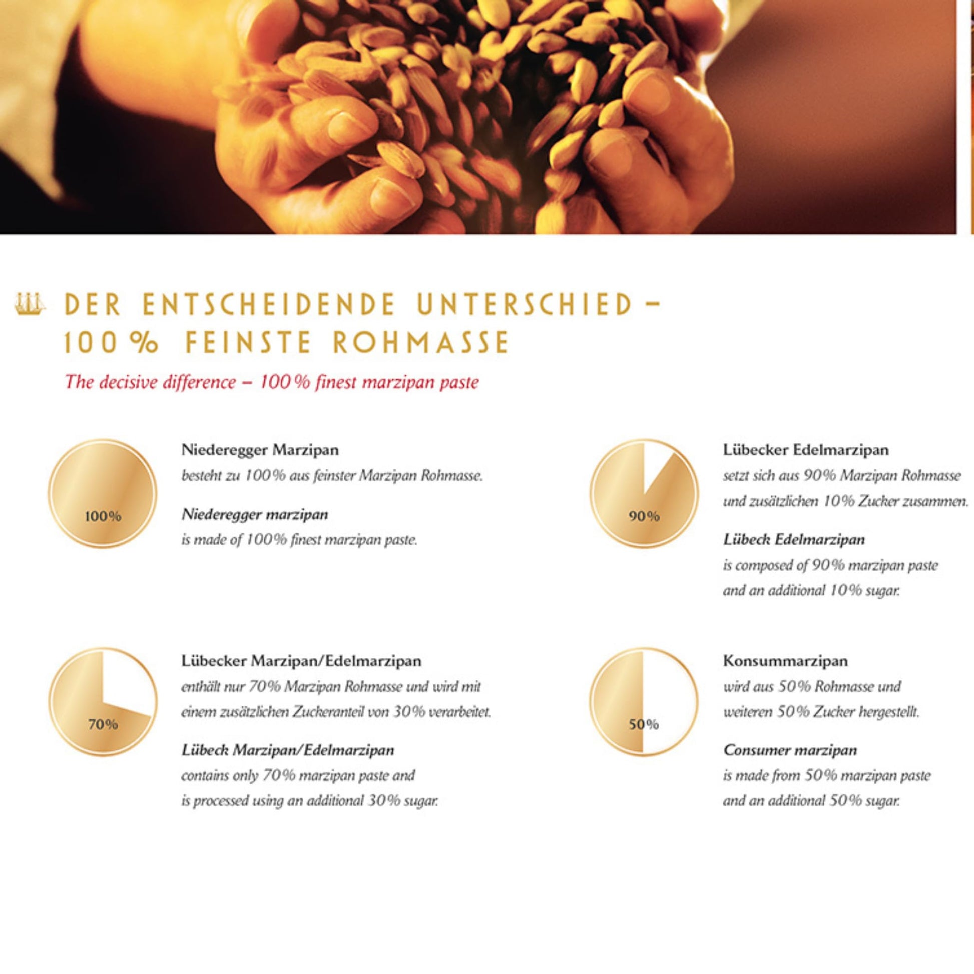 Q: What makes Niederegger marzipan unique?A: Niederegger marzipan is unique due to its rich taste, which comes from a high concentration of selected almonds and a traditional roasting process over an open flame, a technique honed since 1806 in Lübeck, Germany.