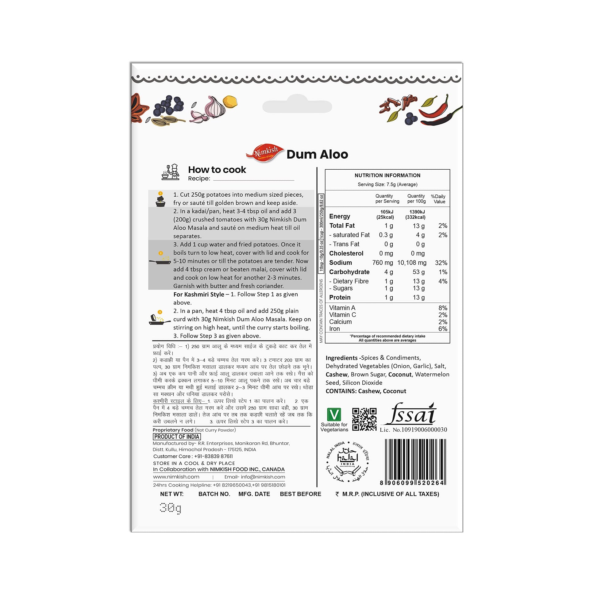 Q: How do I prepare Nimkish Kashmiri Dum Aloo?A: To prepare, simply follow the instructions on the package. Generally, you will need to combine the spice mix with potatoes and water, then cook until the potatoes are tender and infused with the delicious flavors.