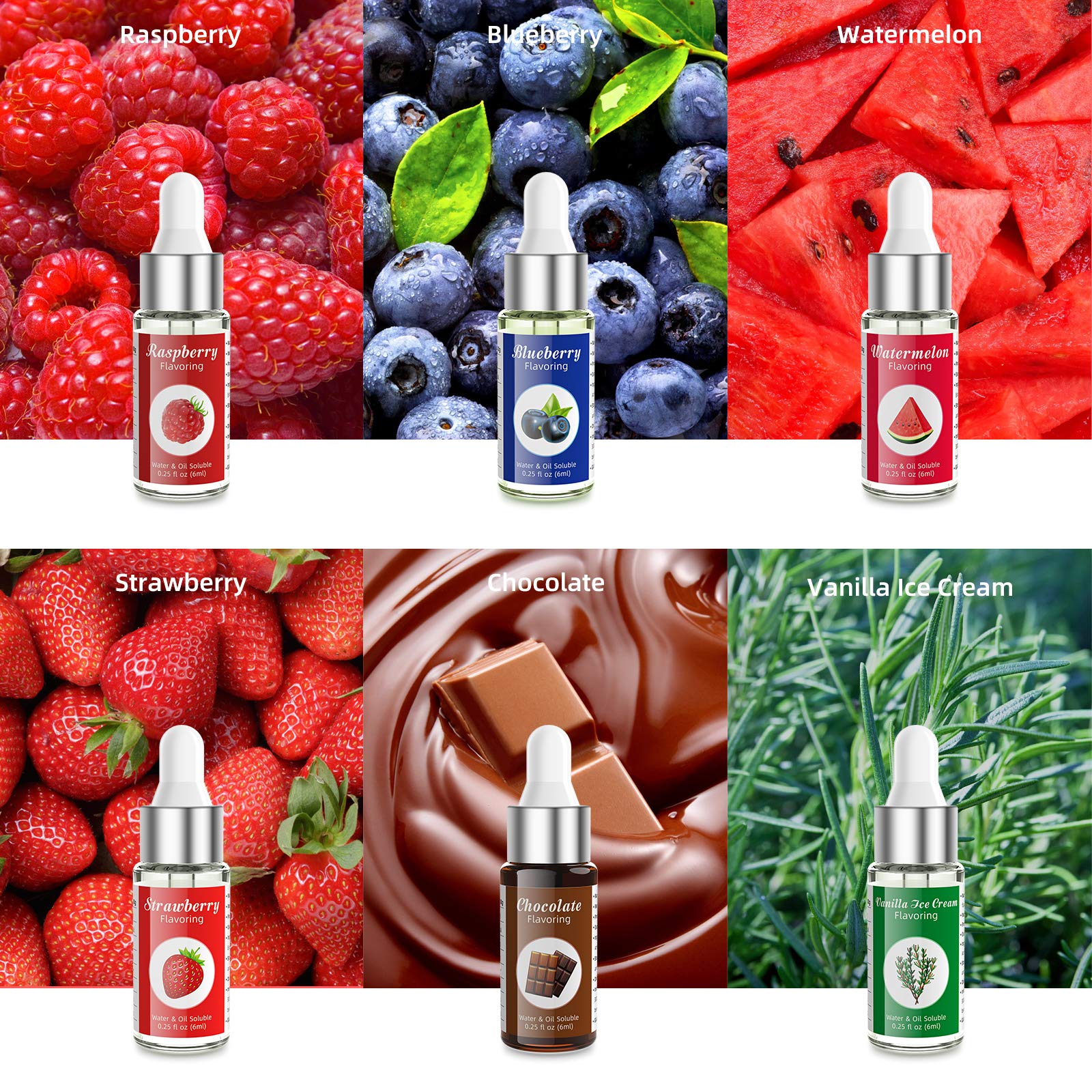 Q: What flavors are included in the Nomeca Food Flavoring Oil set?A: The Nomeca Food Flavoring Oil set includes six popular flavors: Strawberry, Watermelon, Vanilla Ice Cream, Chocolate, Blueberry, and Raspberry.
