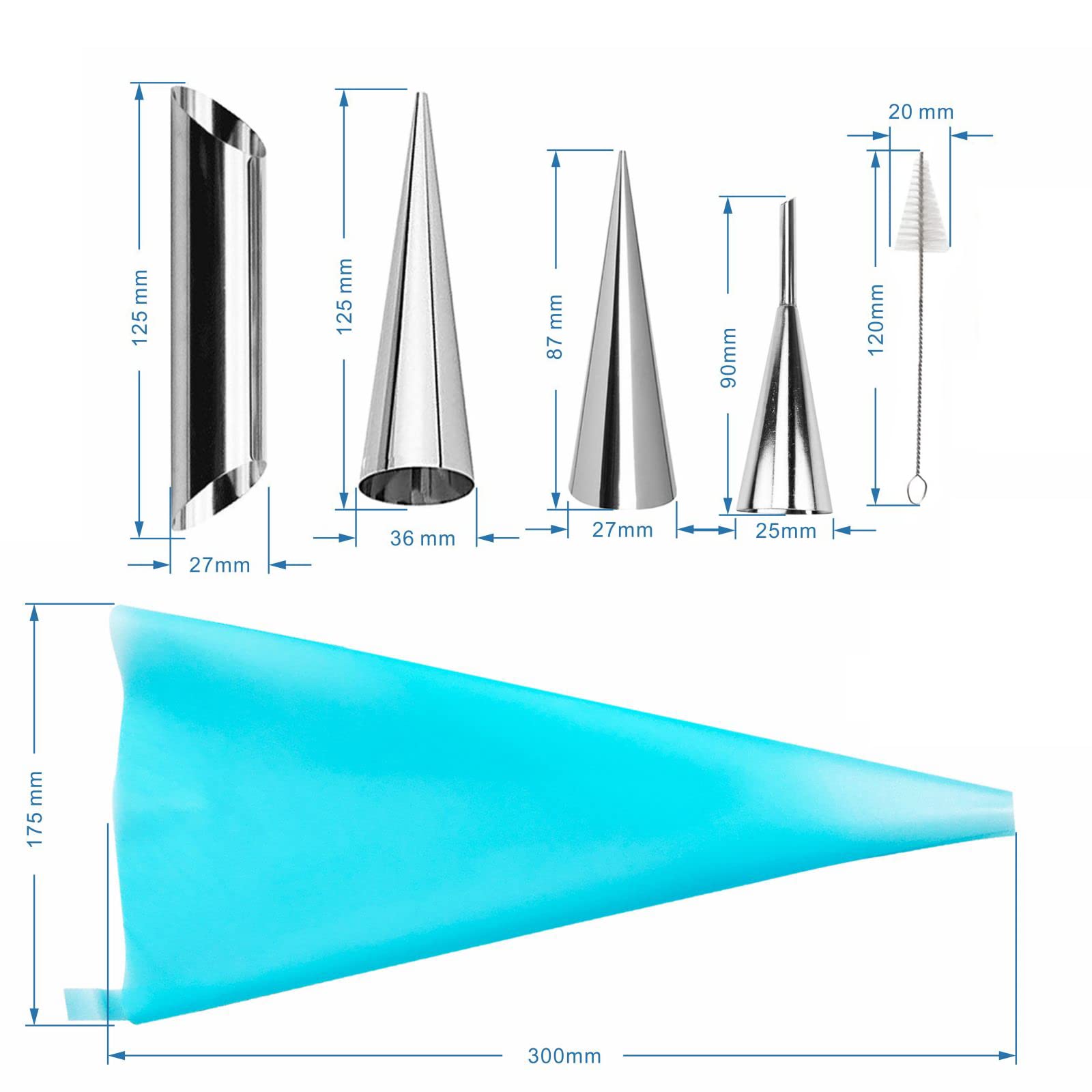 Q: What is included in the FantasyDay Pastry Baking Set?A: The set includes 18 cream horn cone molds, 1 clean brush for easy maintenance, 1 puff nozzle for filling, and 1 reusable piping bag, providing everything you need for your pastry baking.