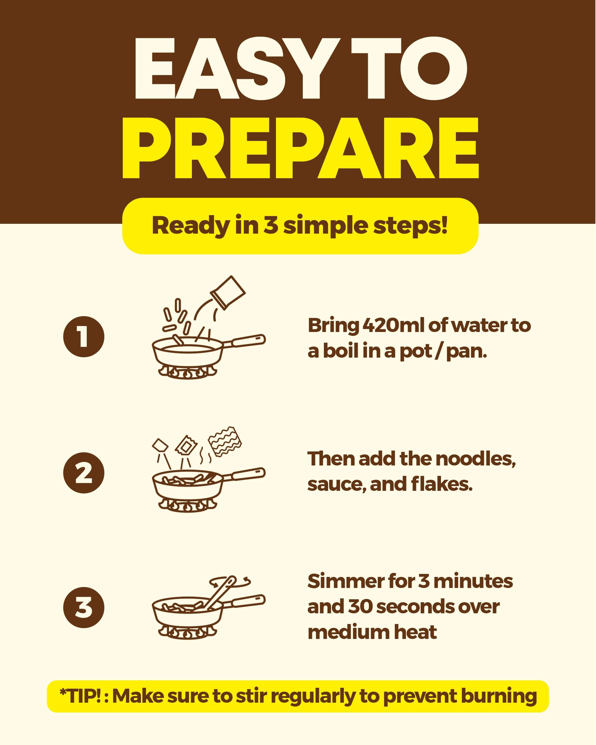 Q: How do you prepare NONGSHIM TAEKYUNG Jjajang Rapokki?A: To prepare NONGSHIM TAEKYUNG Jjajang Rapokki, simply add water to the provided ingredients, boil, and stir. The dish is quick and easy, ready in just 4 minutes, making it a convenient option for busy individuals.