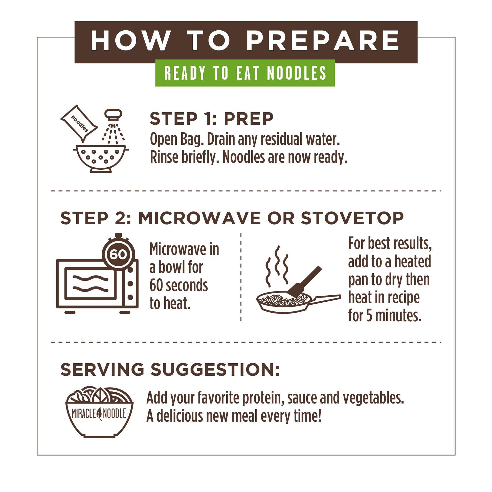 - Q: How do you prepare Miracle Noodle products? A: To prepare Miracle Noodle, simply rinse the noodles under cold water for a minute, then heat them in a pan or microwave. They can be added directly to your favorite sauces or stir-fried with vegetables for a quick meal.