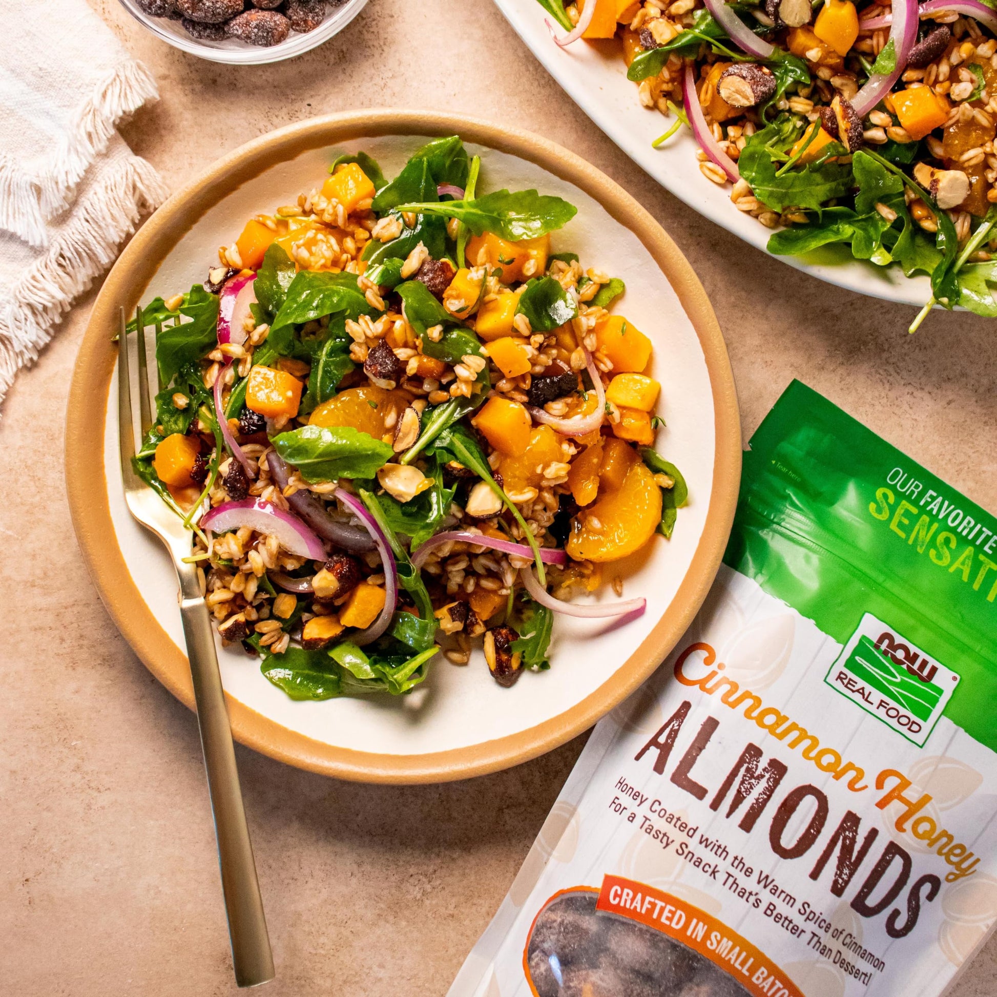 Q: What is the serving size for these almonds?A: The recommended serving size for NOW Foods Cinnamon Honey Coated Almonds is 1/4 cup (28g), and there are approximately 12 servings per container.