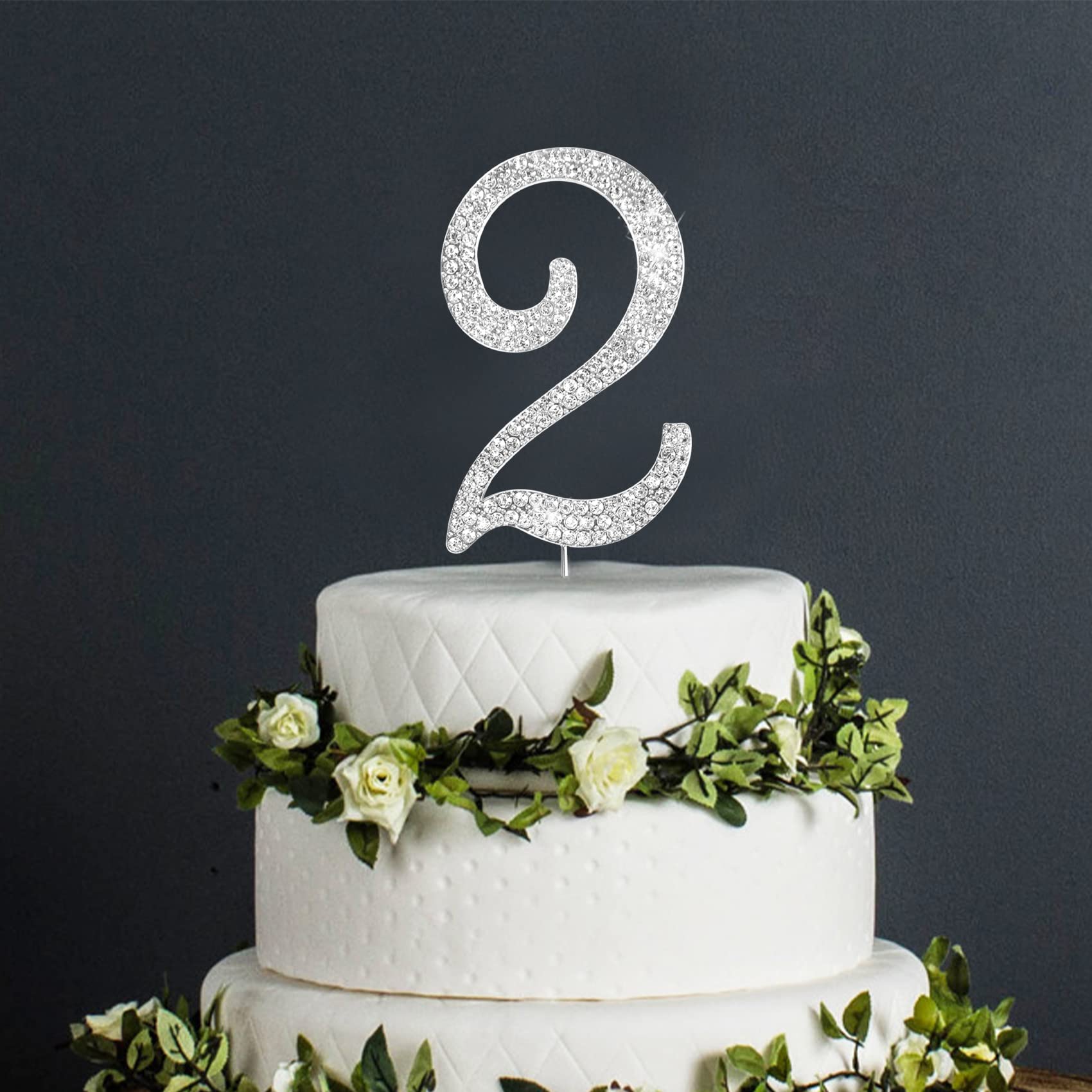 Q: What material is the Number Cake Topper made of?A: The Number Cake Topper is made of a strong metal alloy, which is durable and features sparkly crystal rhinestones for an elegant and eye-catching look.