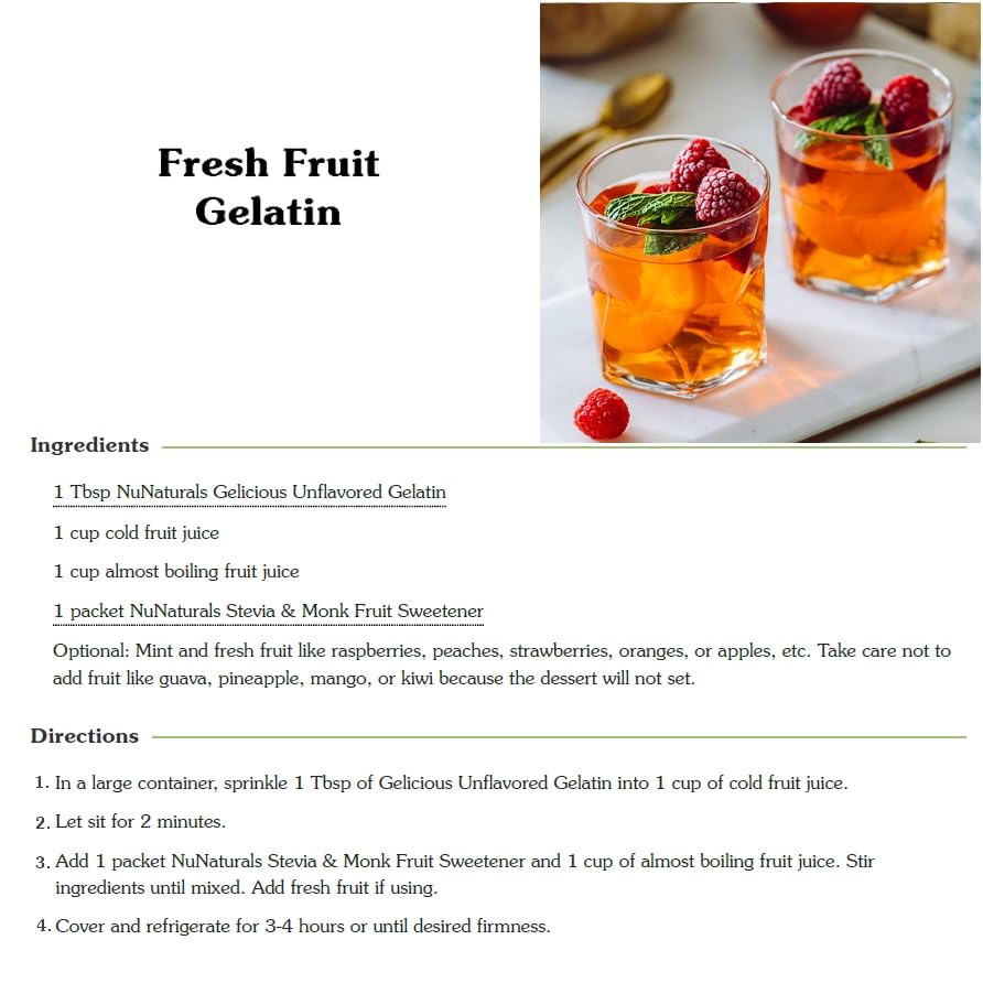Q: What can I use NuNaturals Beef Gelatin Powder for?A: NuNaturals Unflavored Beef Gelatin Powder is versatile and can be used to thicken sauces, soups, and puddings. It’s also perfect for making desserts like cheesecake, fruit jellies, gummies, marshmallows, smoothies, and ice cream.