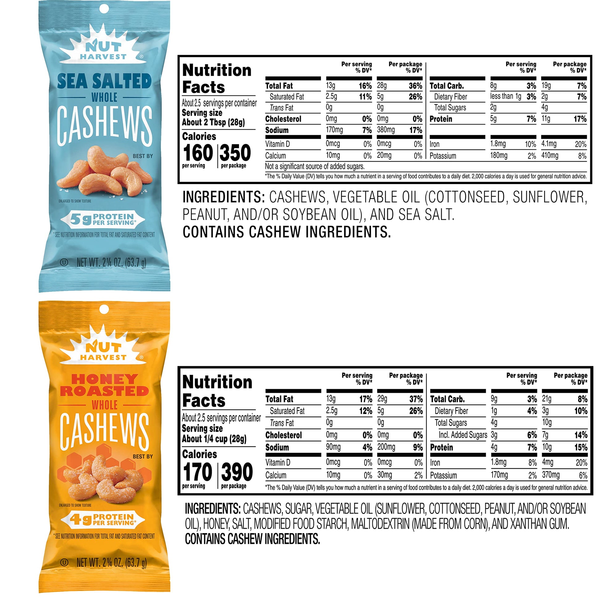 - Q: What are the nutritional benefits of the Nut Harvest Sweet & Salty Cashews? A: The Nut Harvest Sweet & Salty Cashews Variety Pack offers a great source of protein, with 4g of protein per serving for the honey roasted cashews and 5g for the sea salted variety. These nuts also provide healthy fats and essential nutrients, making them a nutritious snack option.