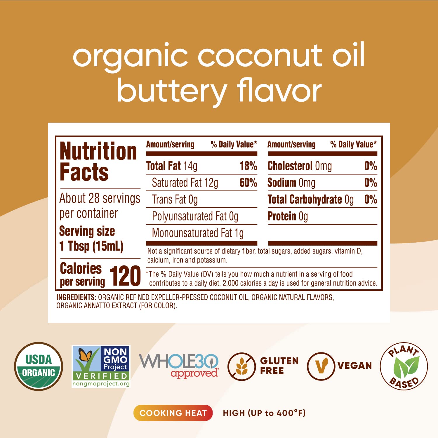 - Q: What are the key benefits of using Nutiva Organic Coconut Oil with Non-Dairy Butter Flavor? A: Nutiva Organic Coconut Oil with Non-Dairy Butter Flavor is rich in lauric acid and MCTs, making it a nourishing alternative to traditional butter. It is ideal for various cooking methods such as sautéing, baking, and spreading, and is suitable for diets including Whole30, vegan, and gluten-free.