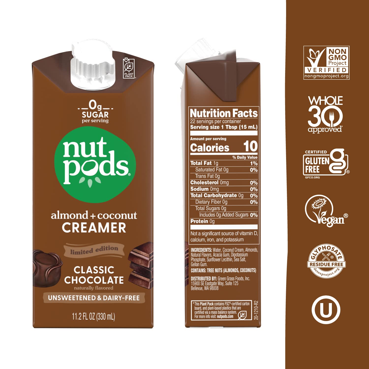Q: What is nutpods Classic Chocolate Unsweetened Dairy-Free Creamer made from?A: nutpods Classic Chocolate Unsweetened Dairy-Free Creamer is made from a blend of almonds and coconuts, providing a rich and creamy texture without dairy.