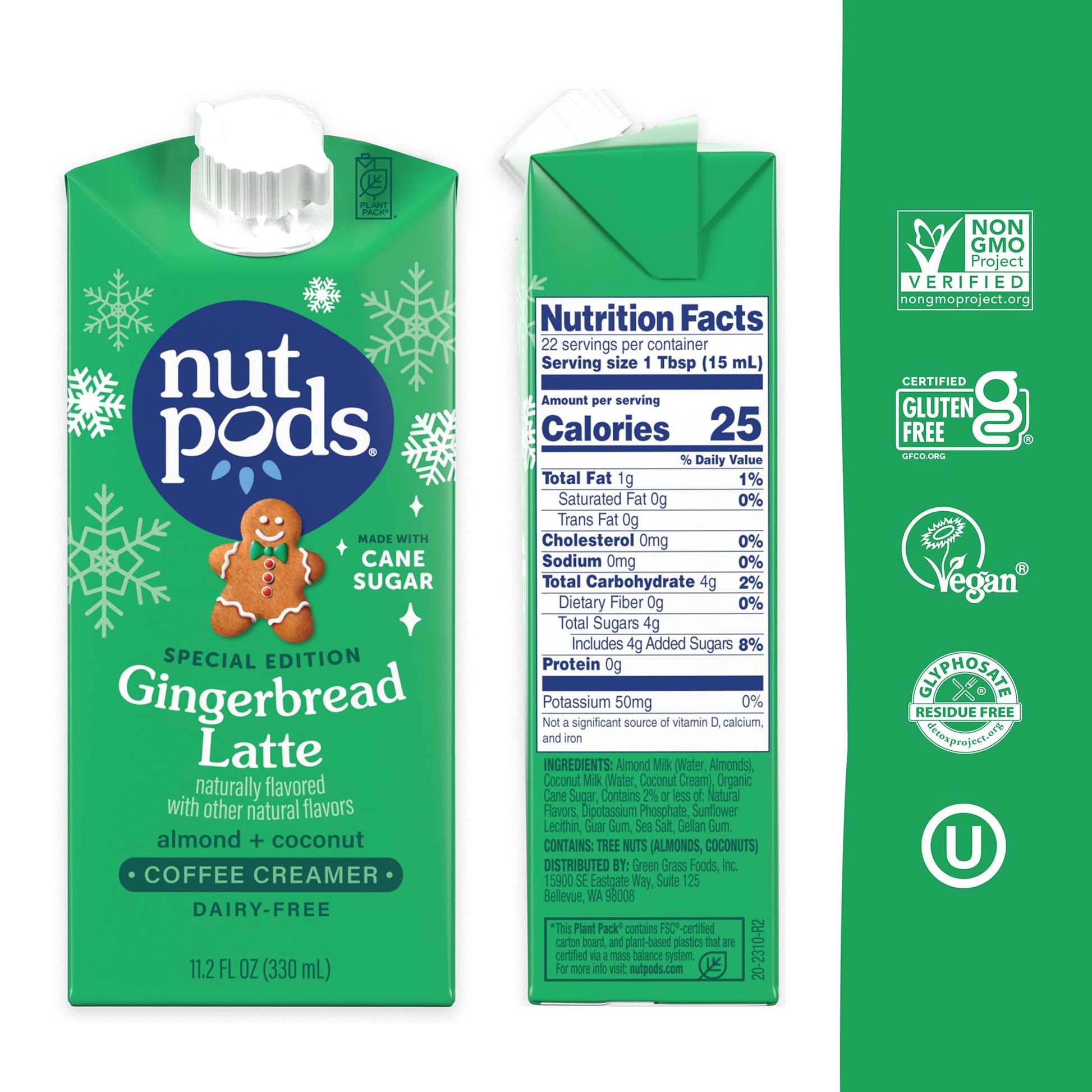 Q: Does nutpods Gingerbread Latte Coffee Creamer contain any allergens?A: nutpods Gingerbread Latte Coffee Creamer is dairy-free and gluten-free, but it does contain almonds. Check the packaging for any additional allergen information.