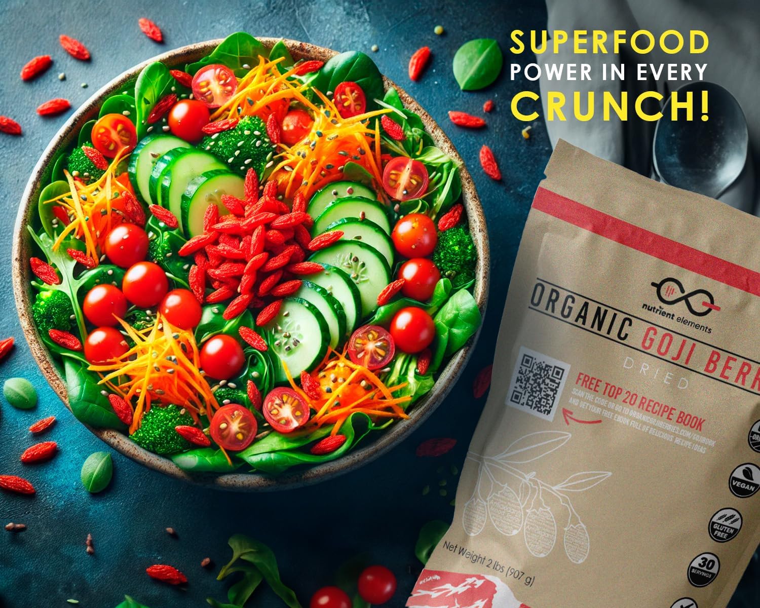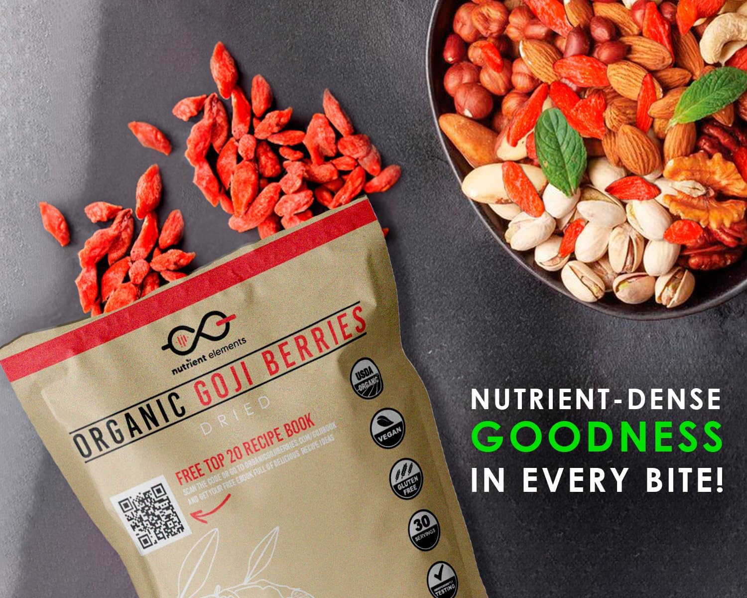 Q: Are Nutrient Elements goji berries organic and non-GMO?A: Yes, Nutrient Elements goji berries are USDA certified organic and non-GMO, ensuring that they are free from harmful chemicals and pesticides.