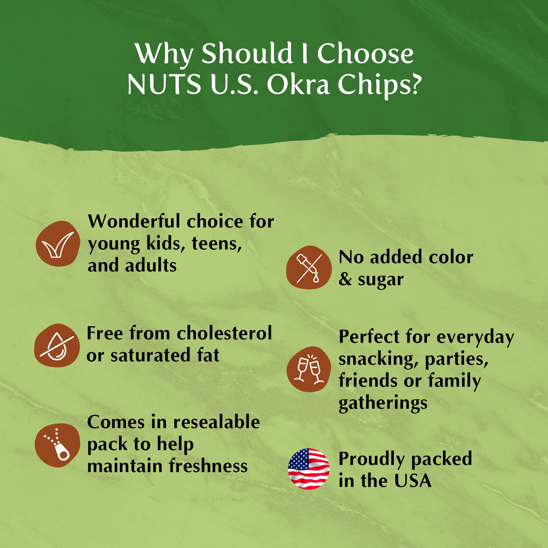 Q: Are there any artificial ingredients in these Okra Chips?A: No, NUTS U.S. Okra Chips are made without any artificial colors or added sugars, ensuring a natural and healthy snacking experience.