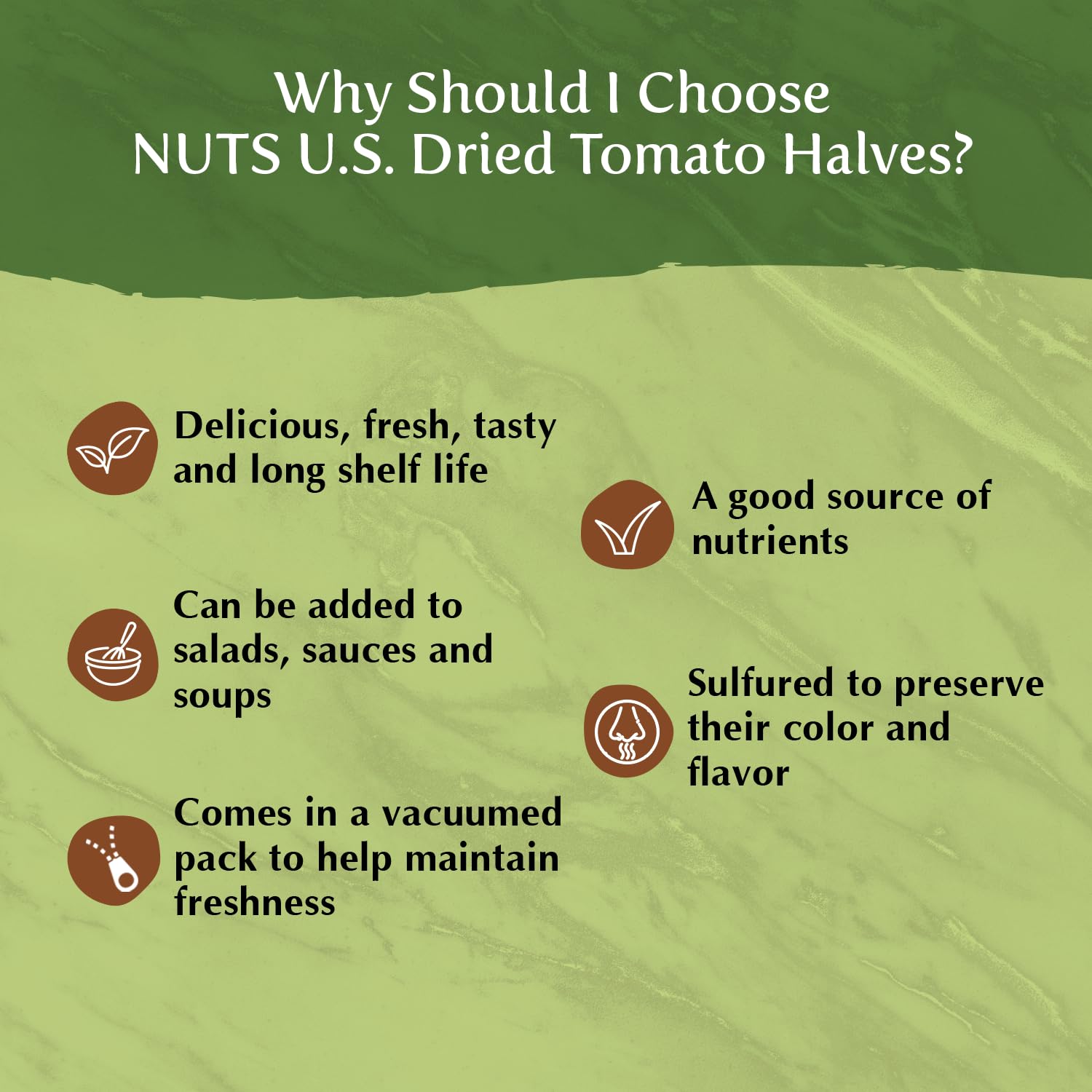 Q: How should I store Sun-Dried Tomatoes after opening the bag?A: Our Sun-Dried Tomatoes come in resealable vacuumed bags. After opening, simply reseal the bag tightly and store it in a cool, dry place to maintain freshness. For longer shelf life, you can refrigerate them.