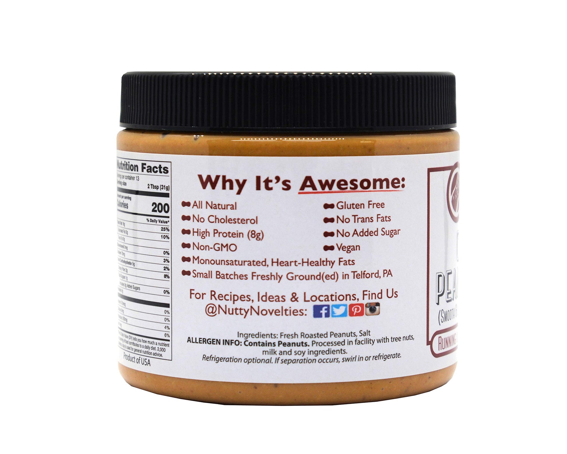 - Q: What are the main ingredients in Nutty Novelties Classic Salted Peanut Butter? A: Nutty Novelties Classic Salted Peanut Butter is made from all-natural peanuts and contains no added sugars, preservatives, or cholesterol. It is also non-GMO and gluten-free.