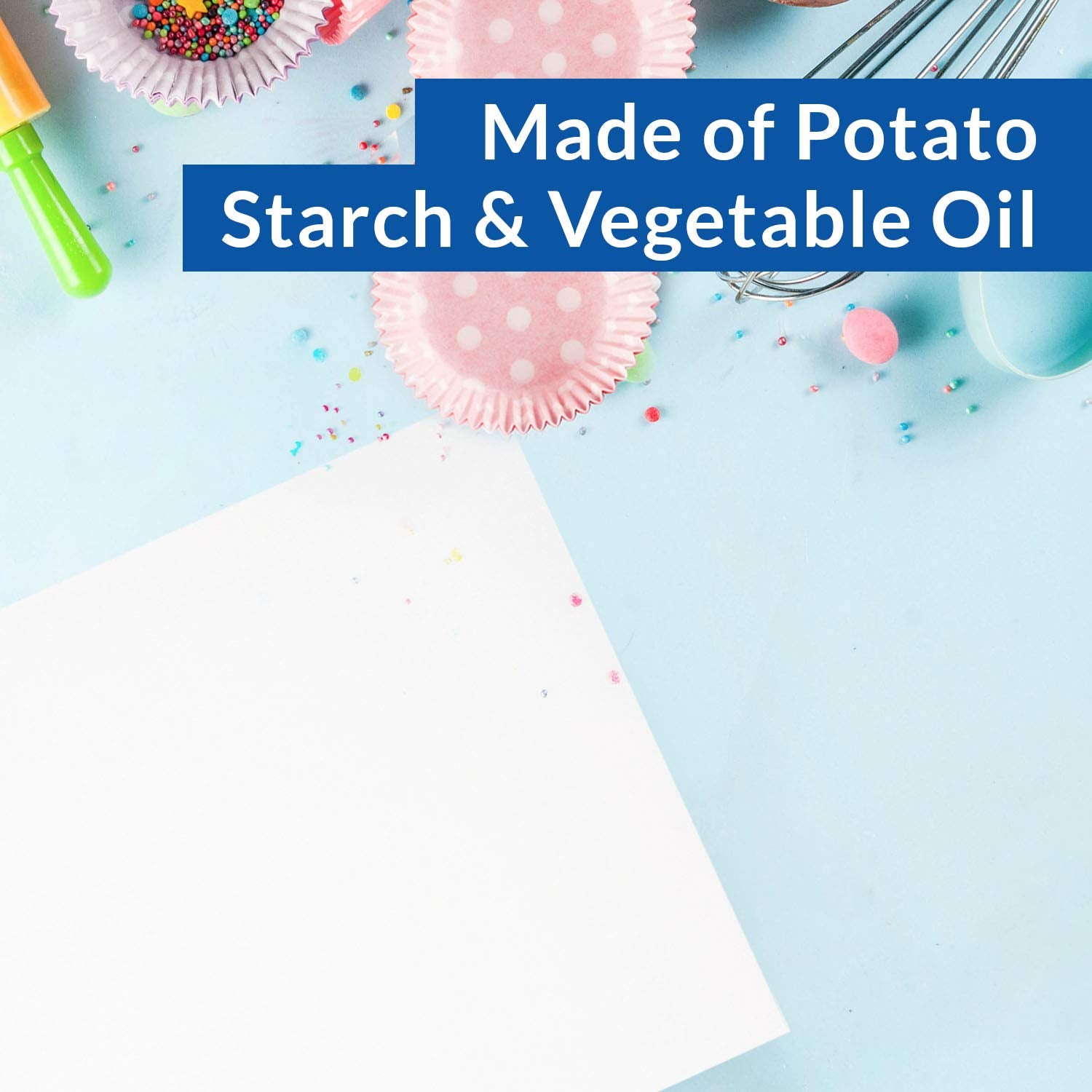 Contains 200 Sheets of Wafer Paper. Made of Potato Starch and Vegetable Oil. Use on Cakes, Cupcakes, Cookies. Made in Holland. Kosher.