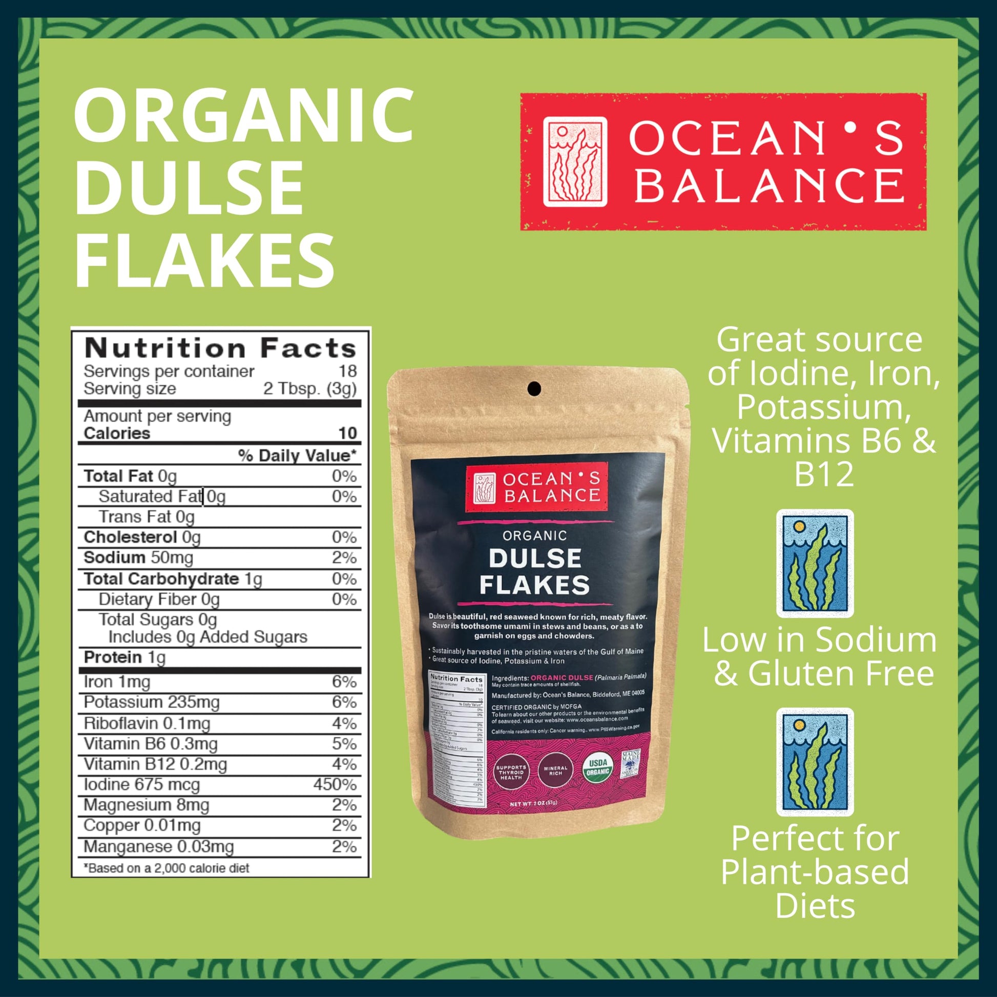 Q: What are Ocean's Balance Organic Dulse Flakes made from?A: Ocean's Balance Organic Dulse Flakes are made from hand-harvested Atlantic Dulse seaweed, which is a nutrient-rich sea vegetable known for its rich, smoky flavor.