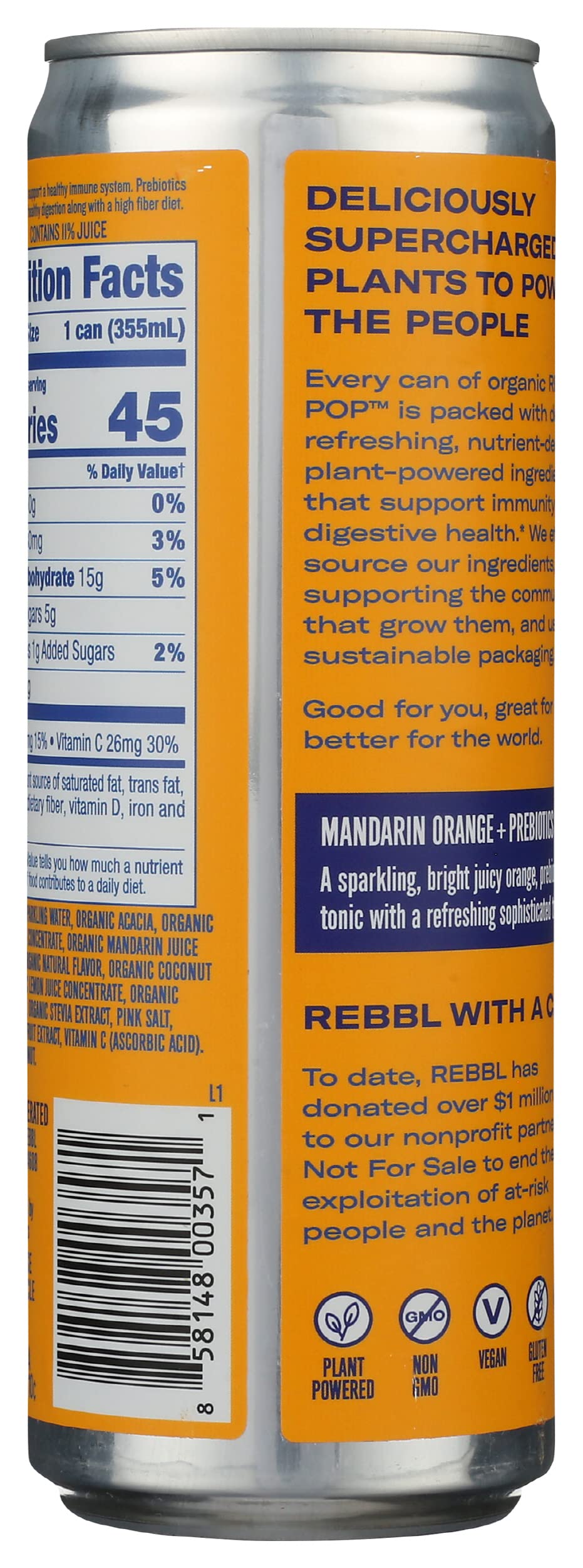 Q: How should I enjoy REBBL Organic Mandarin Orange Prebiotic Sparkling Tonic?A: You can enjoy REBBL Organic Mandarin Orange Prebiotic Sparkling Tonic chilled as a refreshing beverage on its own, or use it as a mixer in cocktails or mocktails for a bubbly twist.