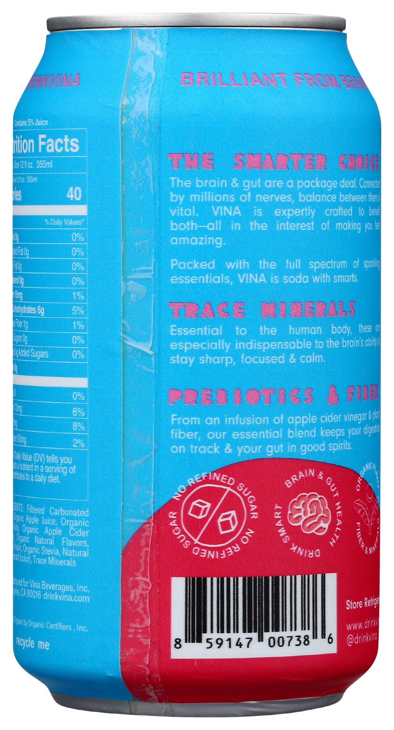 Q: What are the main ingredients in VINA Organic Pomegranate Prebiotic Soda?A: VINA Organic Pomegranate Prebiotic Soda is made from organic pomegranate juice and includes prebiotic fiber that supports digestive health. It is a refreshing, health-conscious alternative to typical soft drinks.