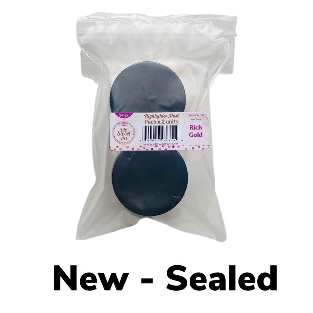 Q: What is the net weight of the Oh Sweet Art Rich Gold Highlighter Pack?A: The Oh Sweet Art Rich Gold Highlighter Pack contains a total net weight of 14g, with each jar containing 7g of highlighter dust.