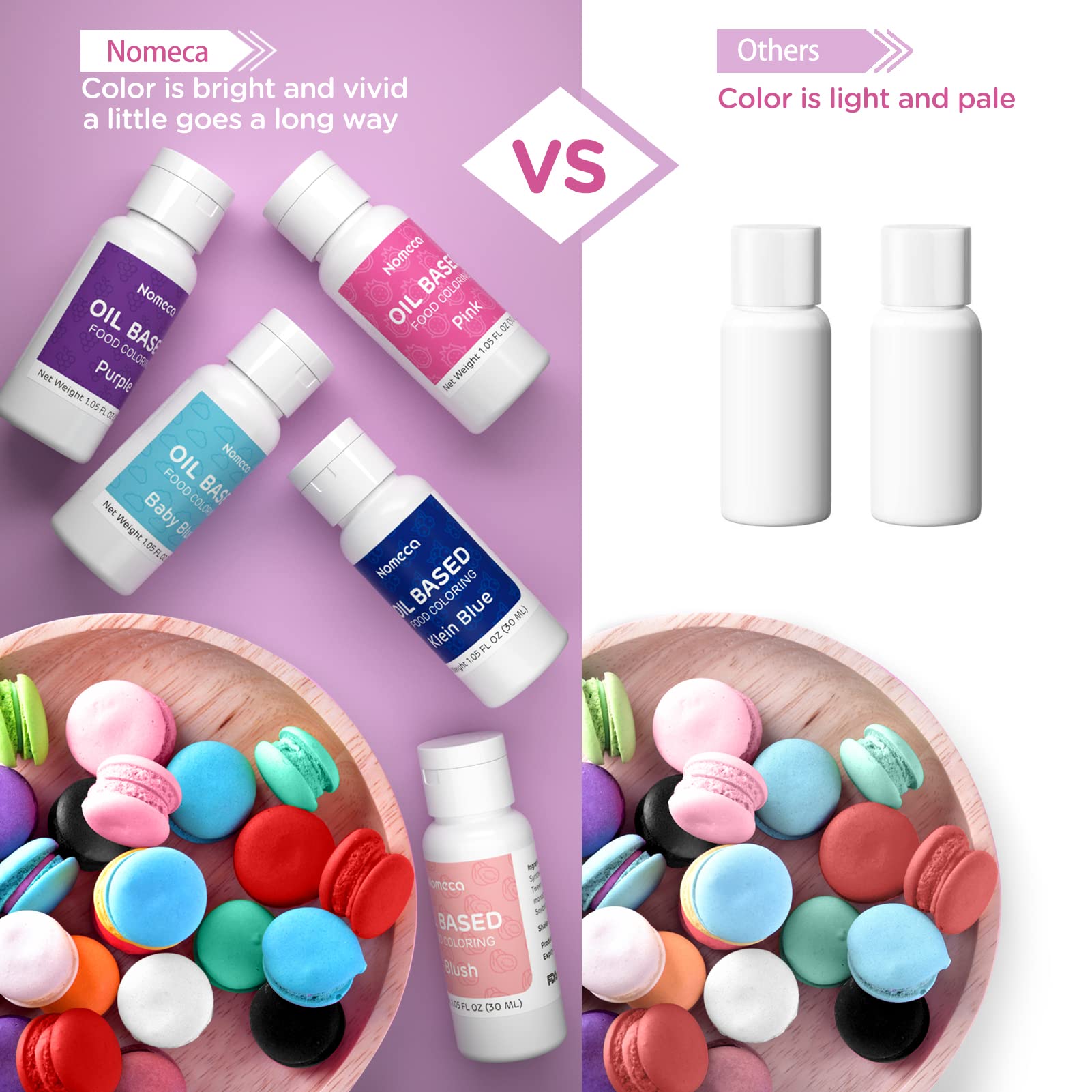 • Q: What is the main difference between oil-based and water-based food coloring? A: Oil-based food coloring, like Nomeca's, is specifically formulated for fat-based ingredients, making it ideal for chocolate, buttercream, and other oil-rich recipes. Unlike water-based colors, oil-based colors do not dilute the consistency of your mixtures and blend seamlessly into your creations.