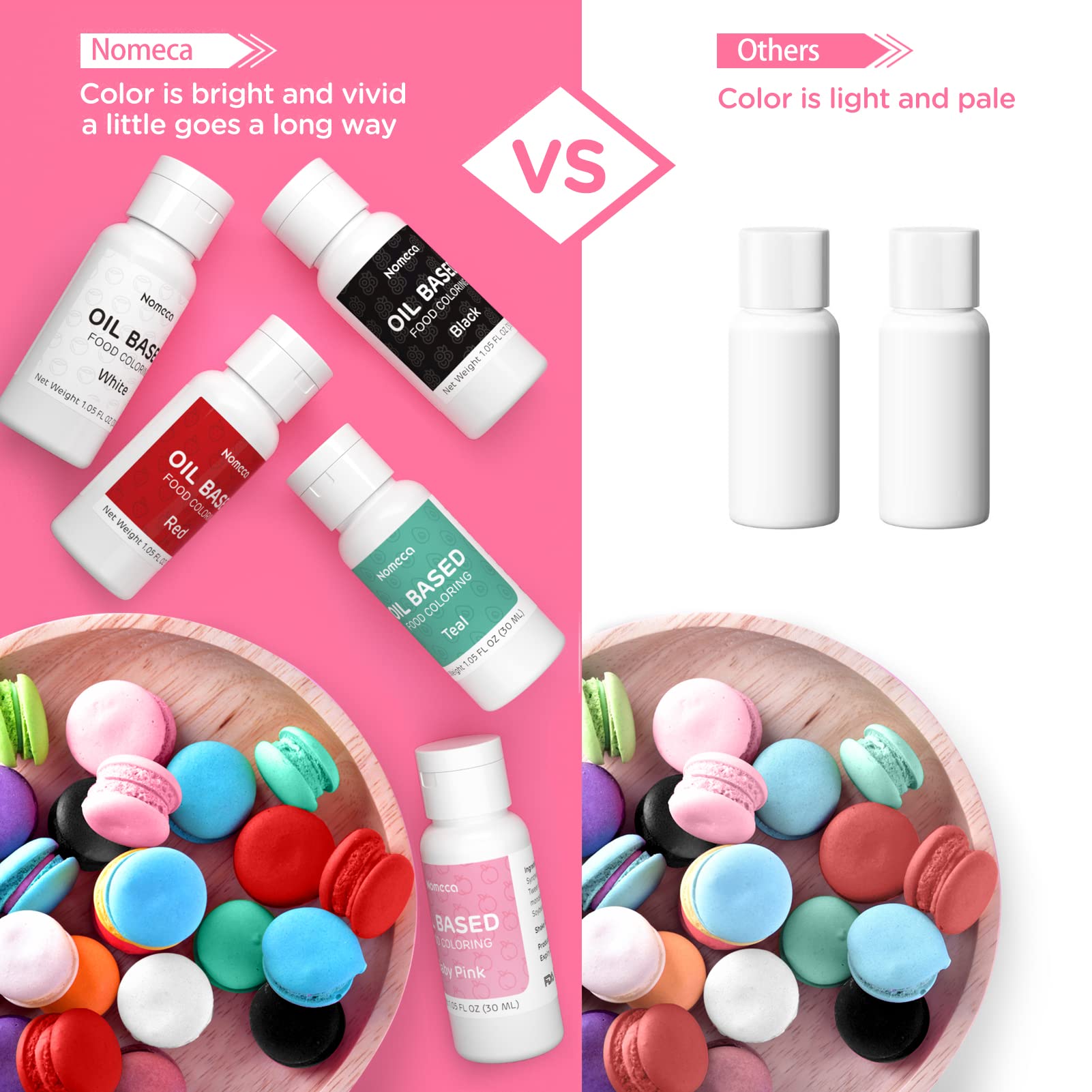 • Q: What makes Nomeca oil-based food coloring different from water-based options? A: Nomeca oil-based food coloring is specially formulated to combine with fat-based ingredients like butter and chocolate, unlike water-based food colorings that can cause separation or inconsistency in recipes. This allows for vibrant colors without affecting the texture of your baked goods.