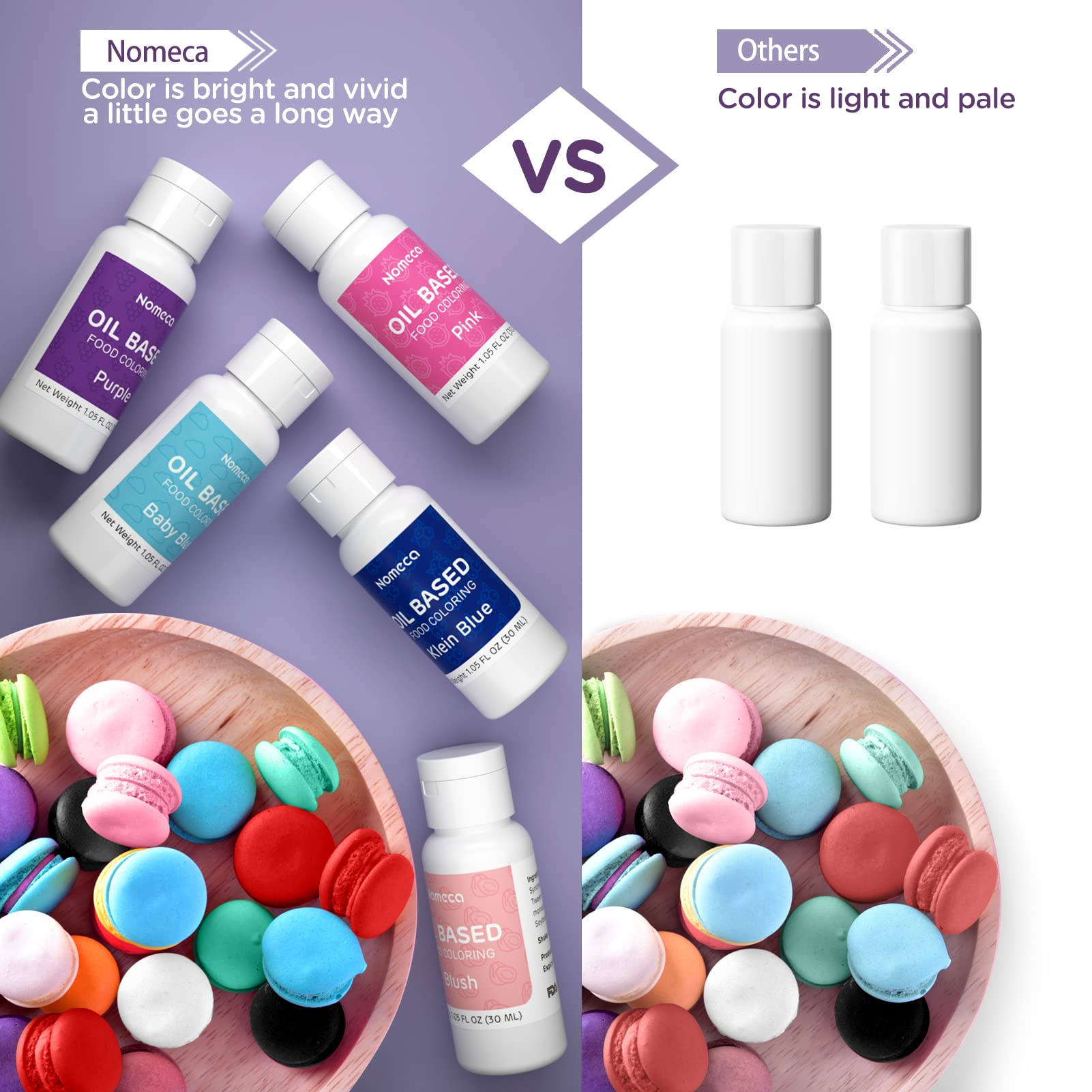 Q: What makes Nomeca oil-based food coloring different from water-based coloring?A: Nomeca oil-based food coloring replaces water with baking-friendly oils, making it ideal for fat-based contents. This formulation ensures it mixes well with ingredients like sugar and butter, where water is not suitable.