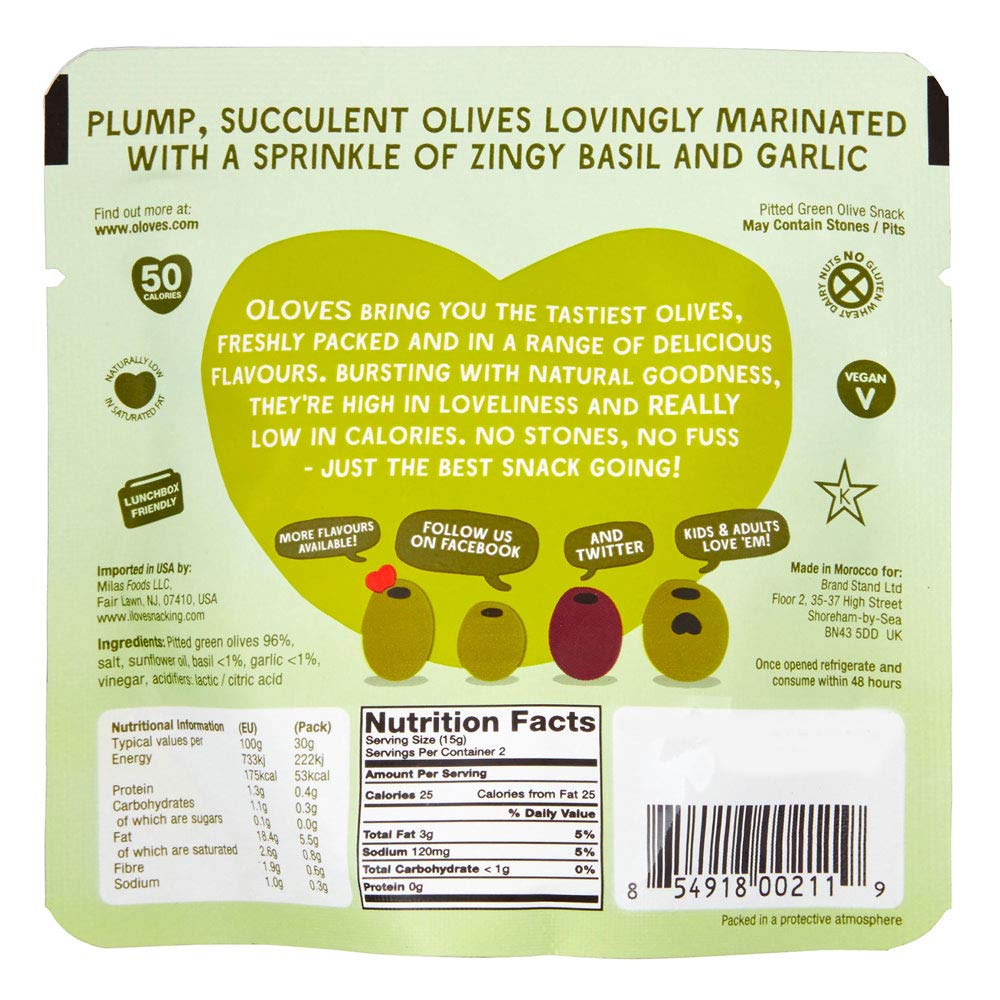 Pitted Green Olives With Basil & Garlic. The Healthy Olive Snack. 50 Calorie Snack. Tasty Mediterranean - Perfectly Marinated Olives With A Pinch Of Basil And Garlic. The Classic Combination! In Barcelona We Had A Dream, To Make A Cool Snack That We Would Love To Eat. That'S Why We Created Oloves, Delicious, Natural, Deli-Style Olives. Oloves Are The Healthy Alternative Snack With No Preservatives And Only 50 Calories Per Bag. The Ready To Eat Treat With No Pits, No Liquid, Just Pure Healthy Goodness And Of Course: A Little Love In Every Olive! No Major Allergens. Vegetarian & Vegan. Naturally Low In Saturated Fat. 12+ Olives Per Bag. May Contain Stones/Pits. Packed In A Protective Atmosphere. Made In Morocco.