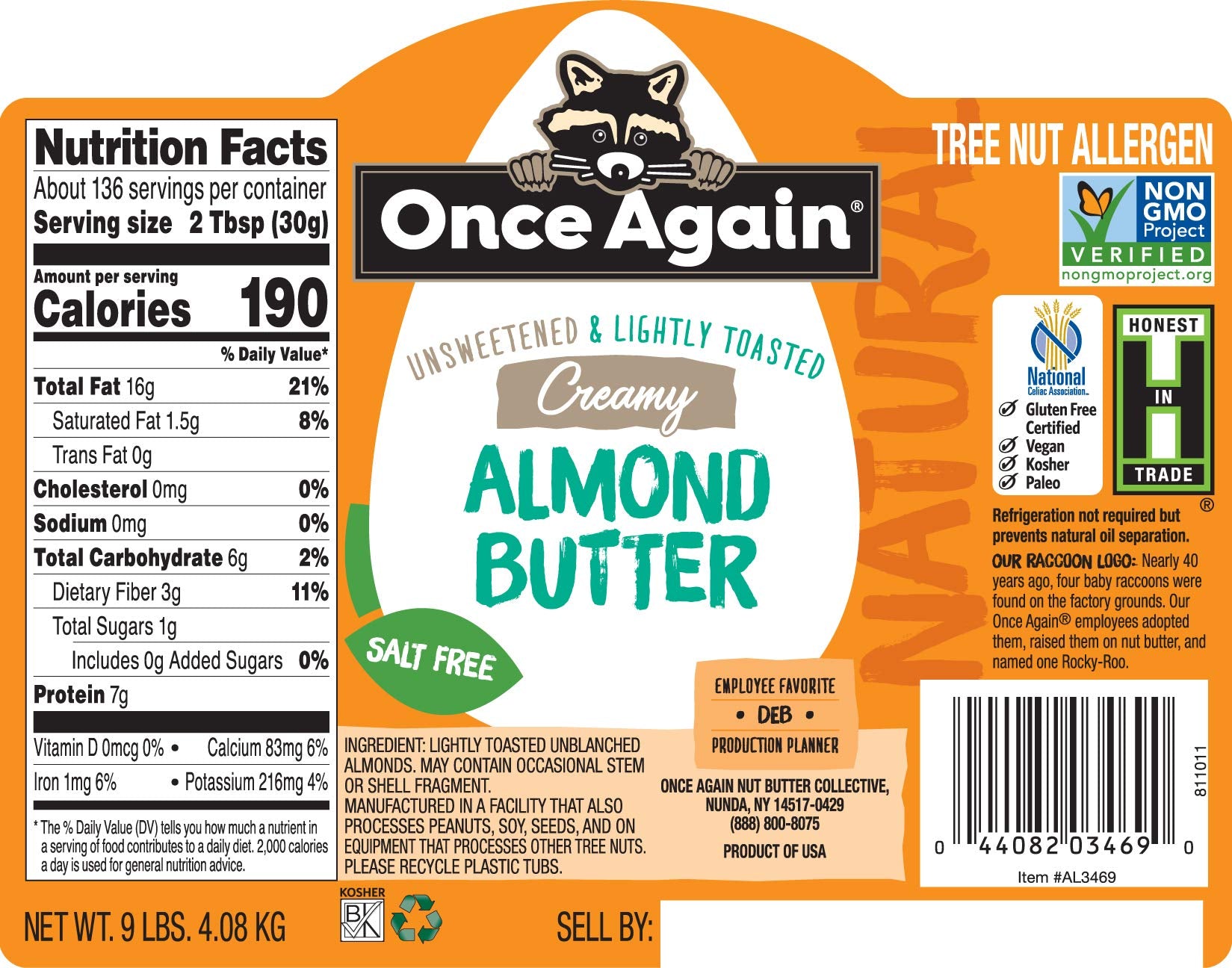 - Q: What makes Once Again Natural Creamy Almond Butter different from other almond butters? A: Once Again Natural Creamy Almond Butter is made from carefully selected, lightly toasted unblanched almonds, resulting in a rich, creamy texture without added salt or sweeteners. It is also produced in a peanut-free facility and is gluten-free certified, vegan, kosher, and non-GMO, making it a great choice for those with dietary restrictions.