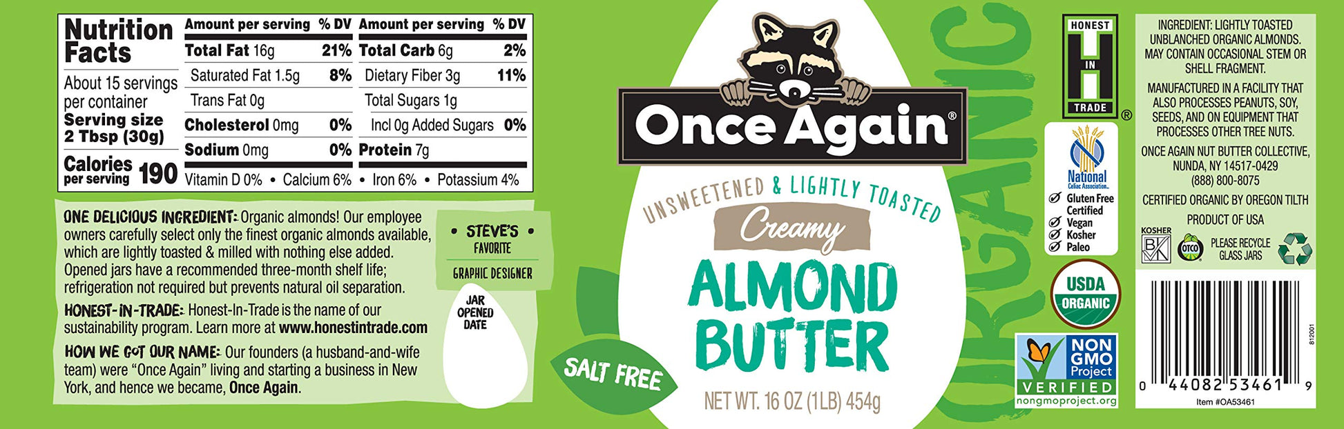 - Q: What makes Once Again Organic Creamy Almond Butter different from other almond butters? A: This almond butter stands out due to its minimal ingredient list, being salt-free and unsweetened, as well as its ethical sourcing from regions like Italy, Spain, and California. Additionally, it is packaged in recyclable glass jars, promoting minimal waste.