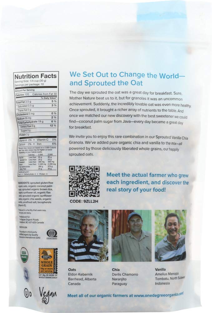 Q: Is One Degree Sprouted Oat Vanilla Chia Granola gluten-free?A: Yes, One Degree Sprouted Oat Vanilla Chia Granola is gluten-free, making it a suitable option for those with gluten sensitivities or celiac disease.