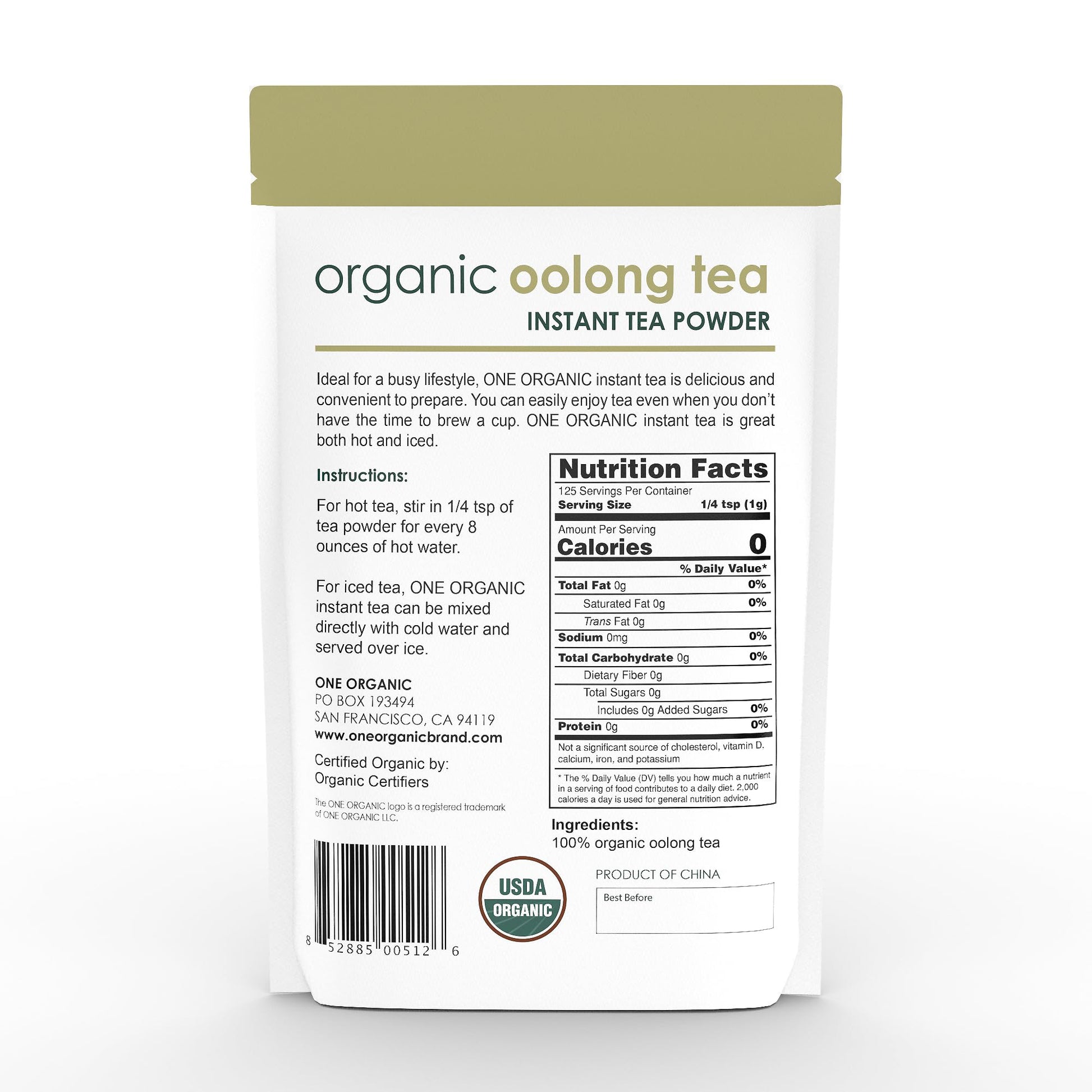 Q: What is ONE ORGANIC Instant Oolong Tea Powder made of?A: ONE ORGANIC Instant Oolong Tea Powder is made of 100% organic tea, featuring a single ingredient that is pure and free from sugars, sweeteners, fillers, artificial ingredients, or preservatives.
