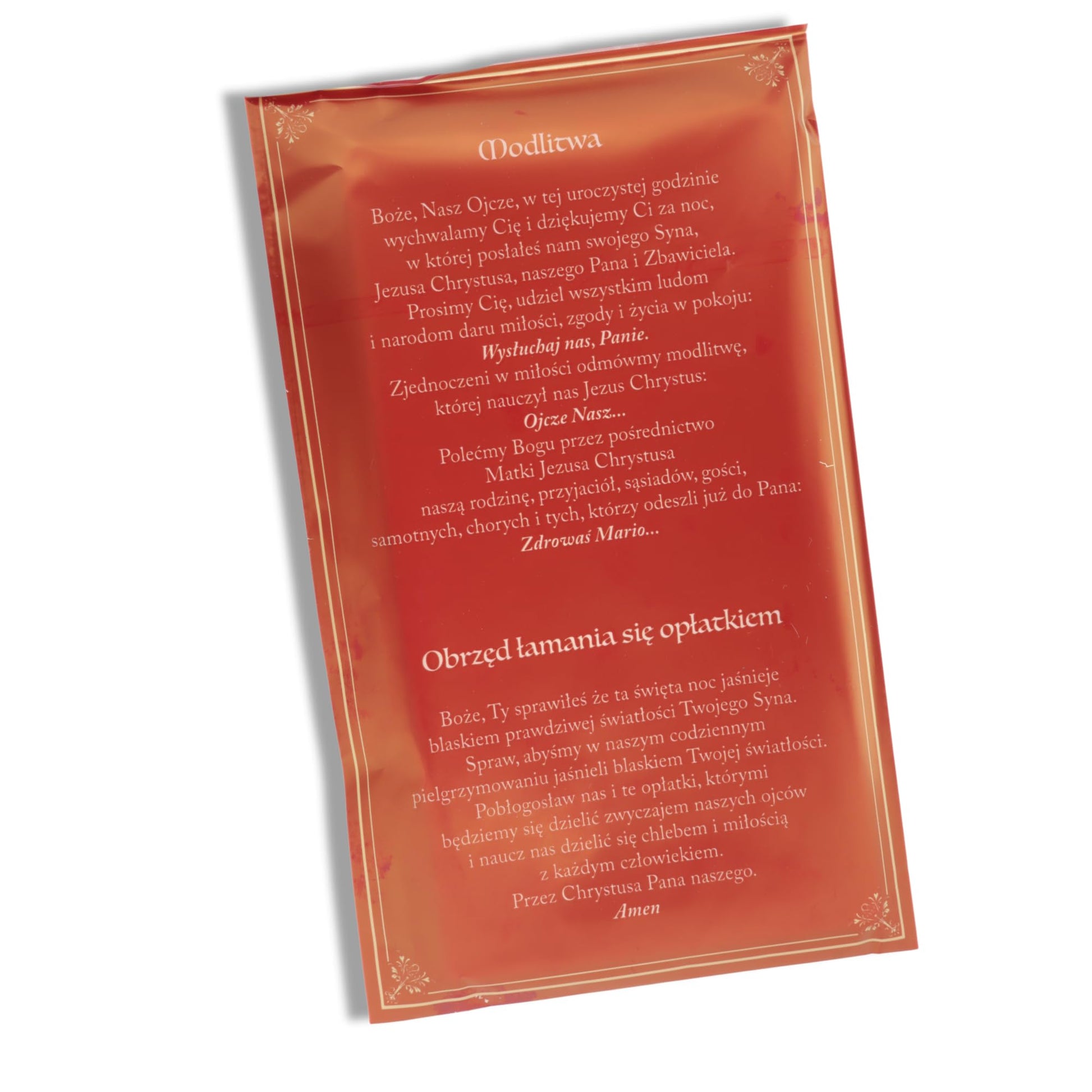Q: What is the significance of the pink wafer in the Oplatki set?A: The pink wafer represents a special part of the Oplatki tradition and is included to symbolize joy and blessings during the Christmas season, complementing the two white wafers.