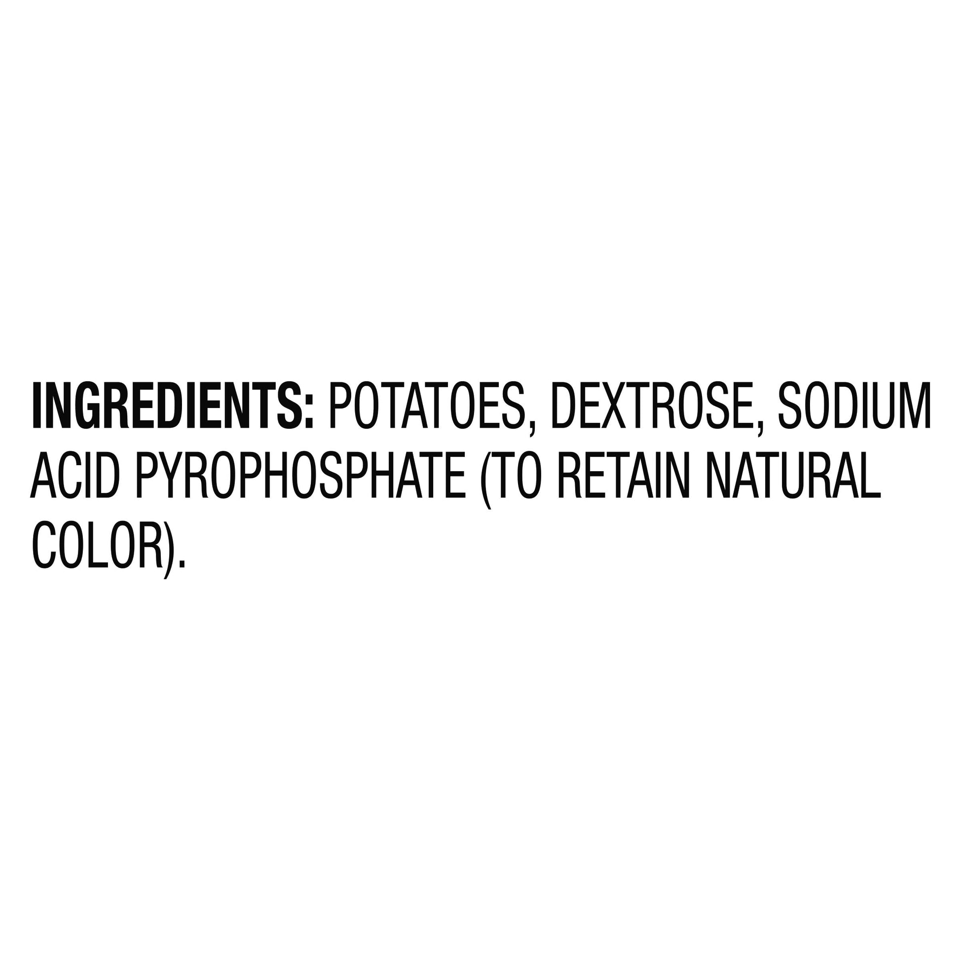 - Q: What are the dimensions of the Ore-Ida Diced Hash Brown Potatoes bag? A: The bag measures six point six one inches in length, seven point nine nine inches in width, and three point one nine inches in height. These dimensions make it easy to store in your freezer.