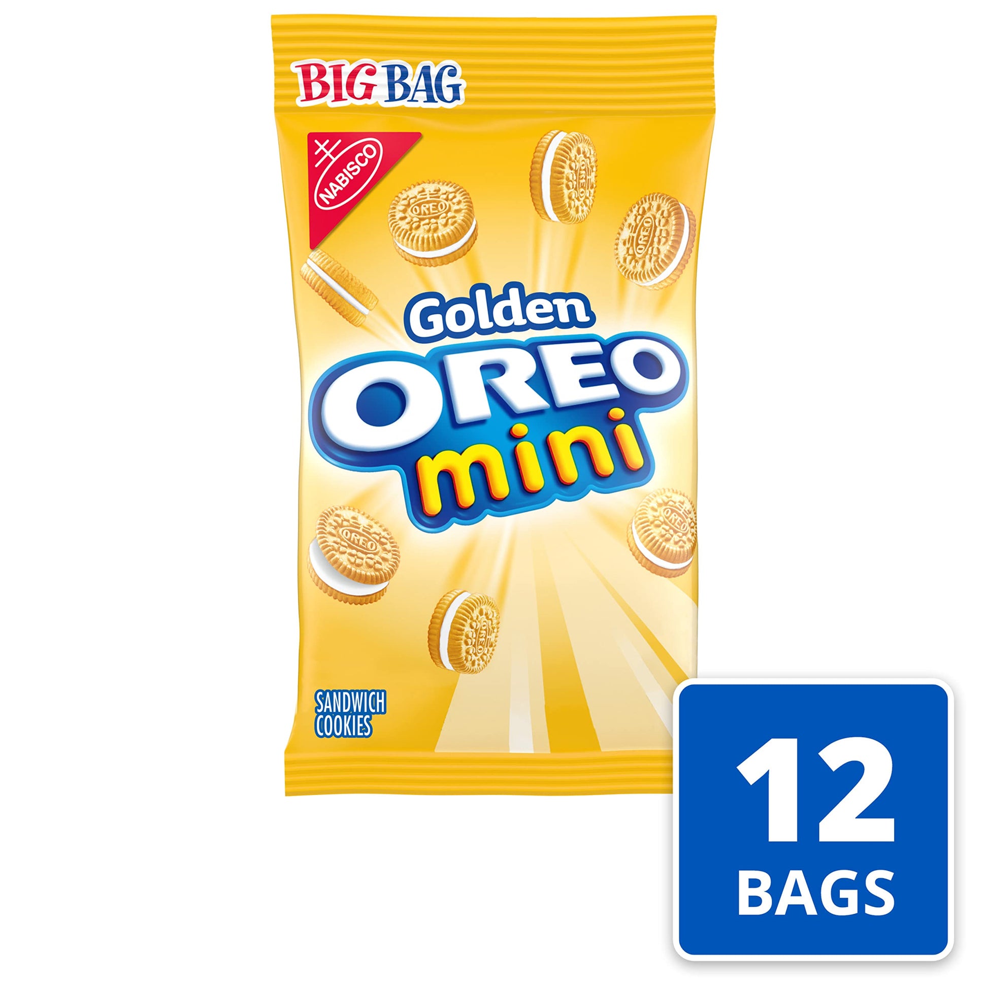 OREO Mini Golden Sandwich Cookies pack the classic flavor you love into perfect bites for easy snacking. These mini vanilla sandwich cookies are filled with classic OREO creme, making them supremely delicious. Golden OREO mini cookies are great for sharing with friends and family, serving at parties, or enjoying with cold milk. Toss one of these big bag snack food packs into your lunch for a tasty treat, or grab a pack at home whenever you're craving sweet snacks. OREO Mini snack cookies also make a great dessert topper that you can add to ice-cream, brownies and cakes. Bulk cookie pack of OREO Mini sandwich cookie big bag snack packs are the perfect size for stashing away for yourself or keeping ready for snacks on the go.